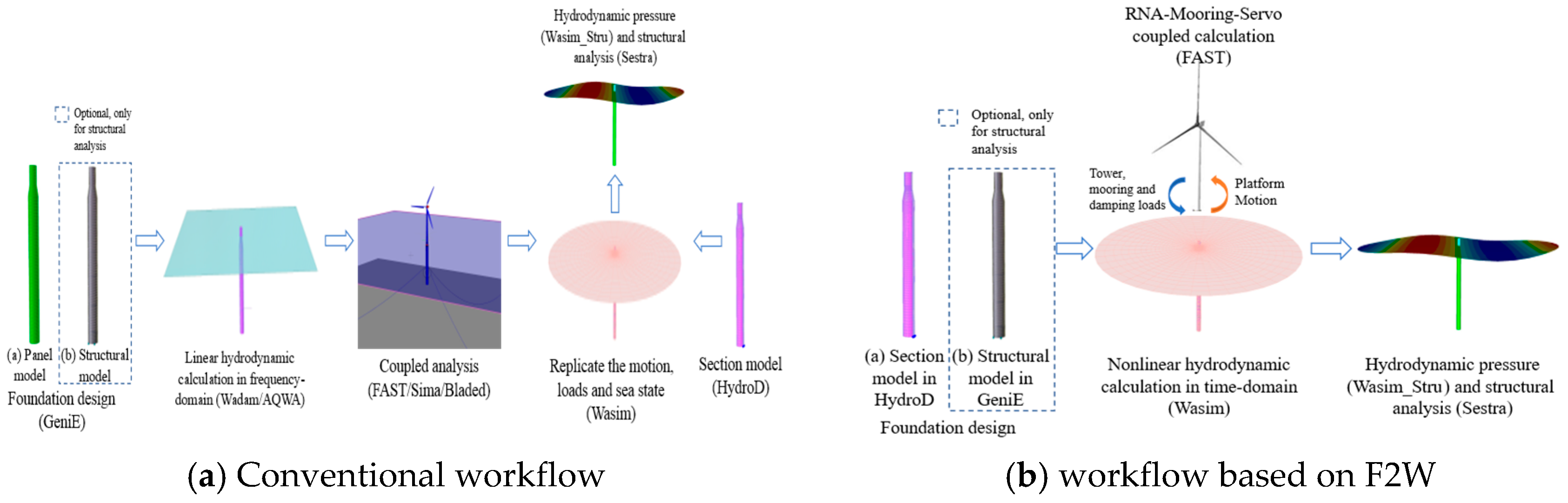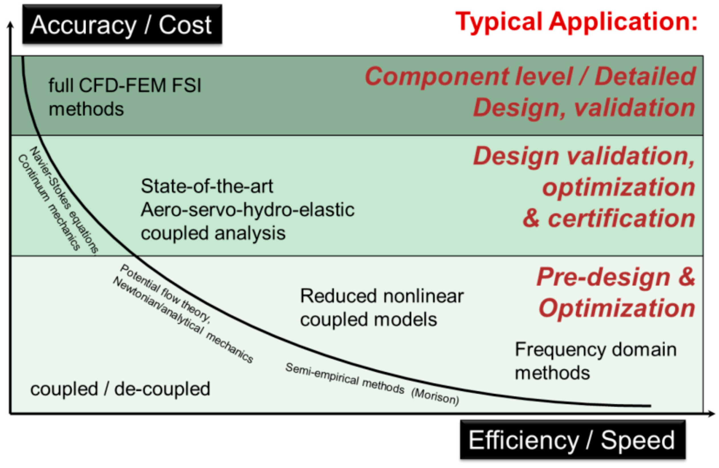 | Frequency domain | Based on linear superposition; solves in the frequency-domain. | Captures main characteristics but misses nonlinear behavior. | Fast solution speed. | Preliminary design |
