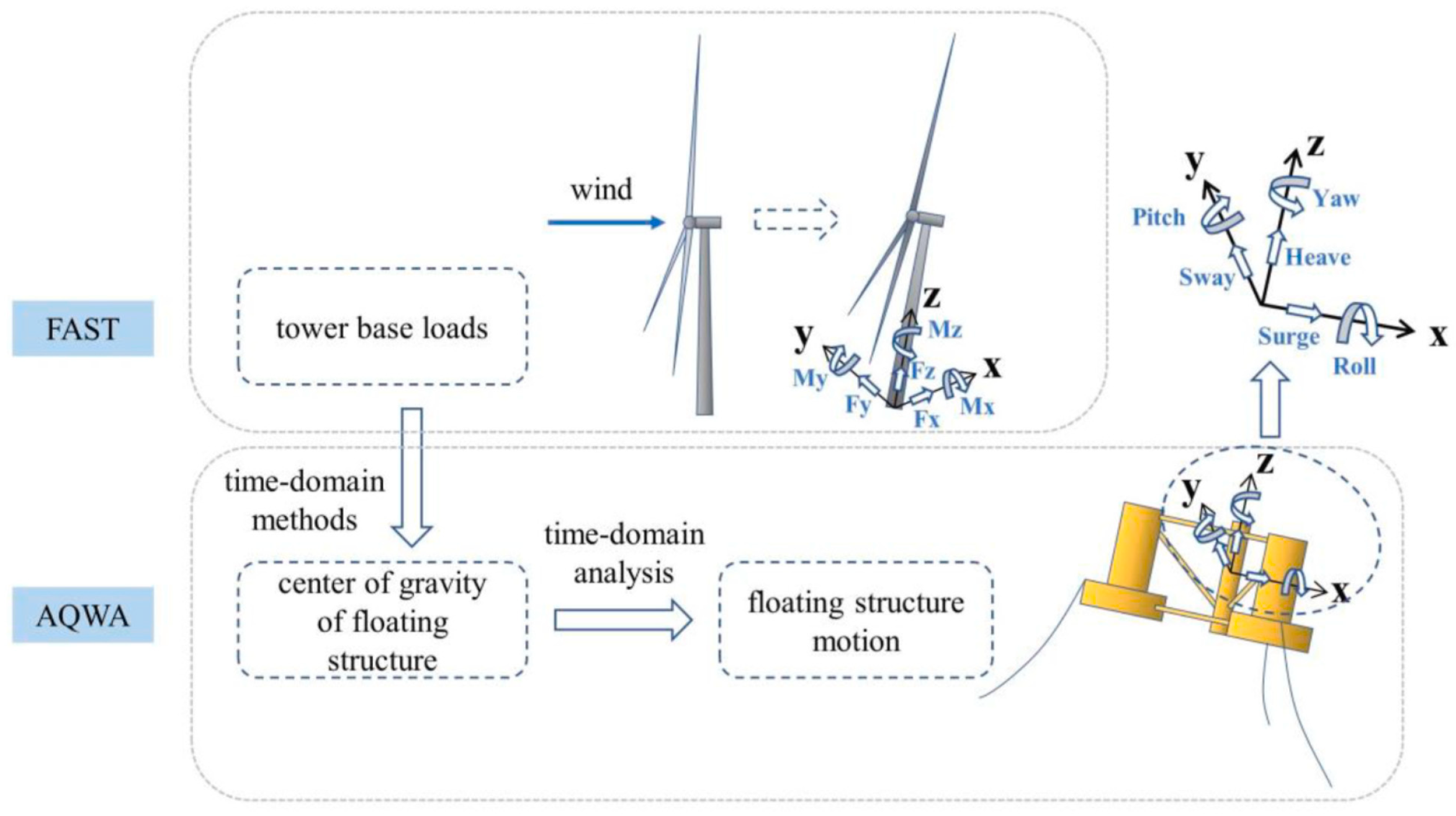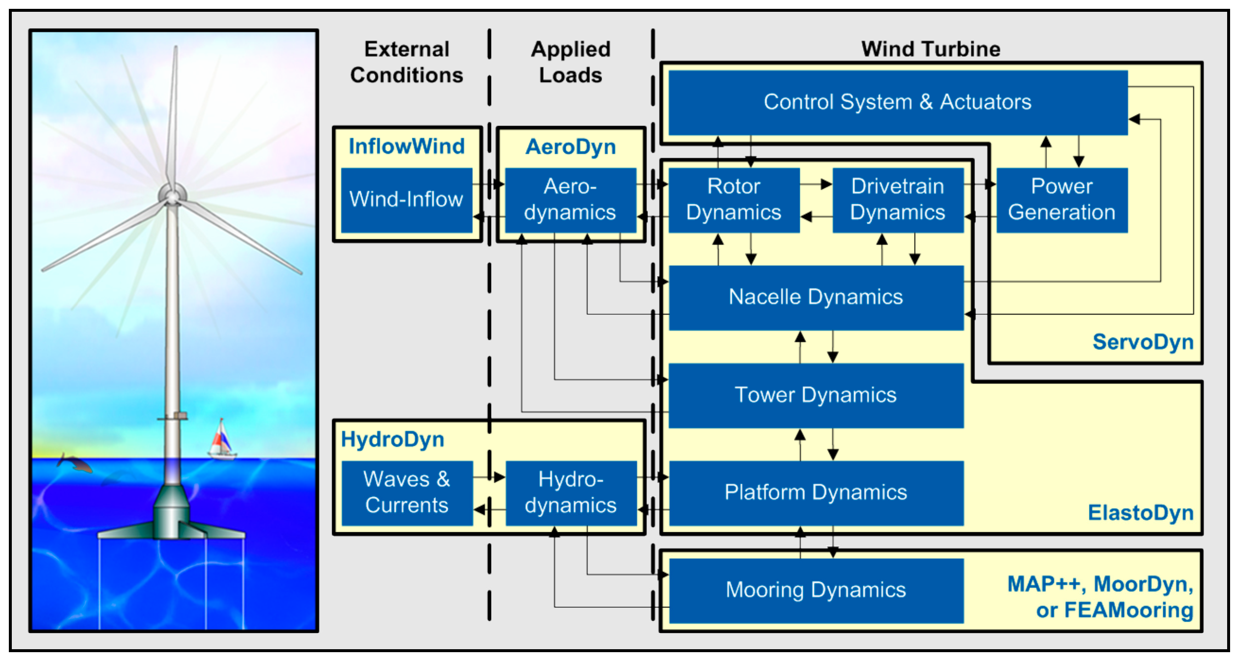 | FAST | (BEM or GDW) + DS + DI | T: Mod/MBS P: Rigid | PF + QD + MD | QS/FE/Dyn | DLL or UD or SM | Jonkman, et al. [148] |