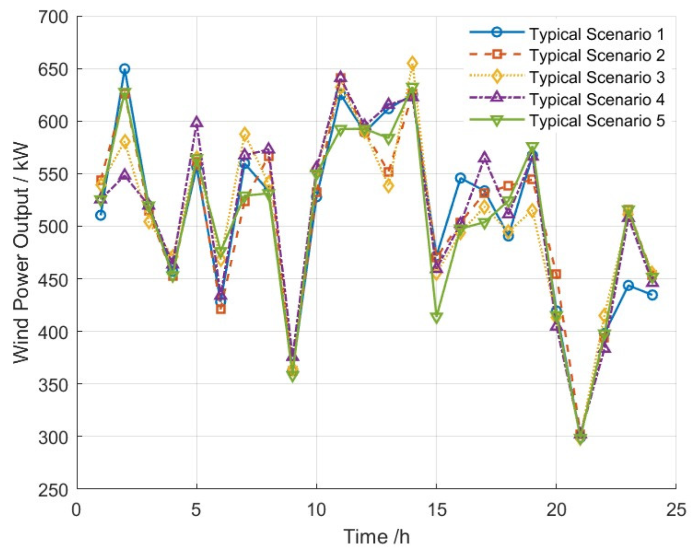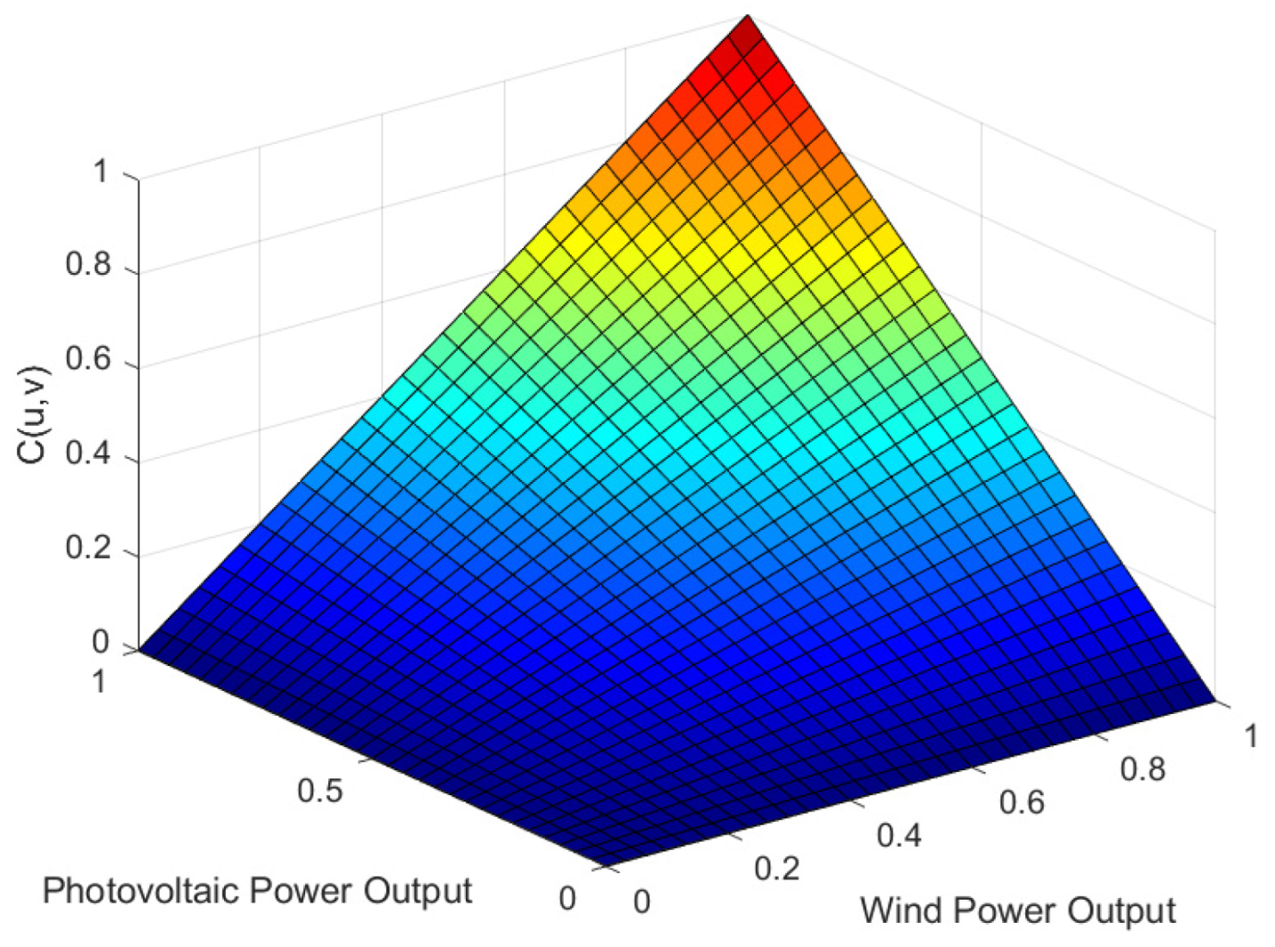 - Through combining kernel density estimation and copula functions, it can generate typical scenarios and probabilistic fuzzy sets that account for wind–solar correlation to enhance the accuracy of probabilistic fuzzy sets.
