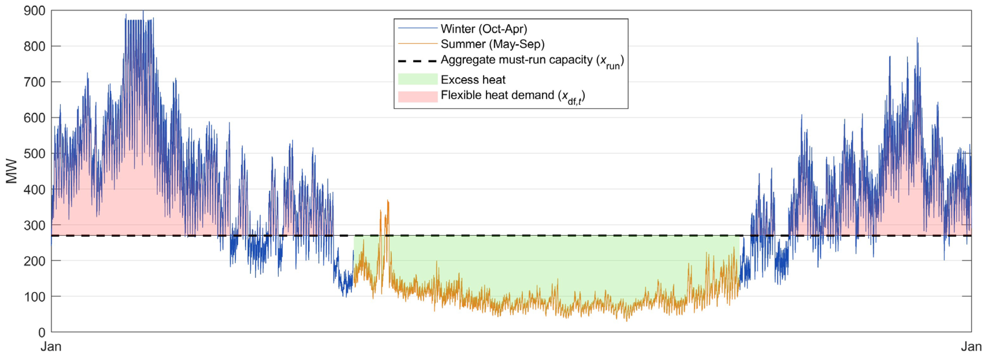 - Excess heat output may occur if demand is lower than must-run capacities. In such cases, surplus heat generation is assumed to be technically manageable (e.g., via dissipation).