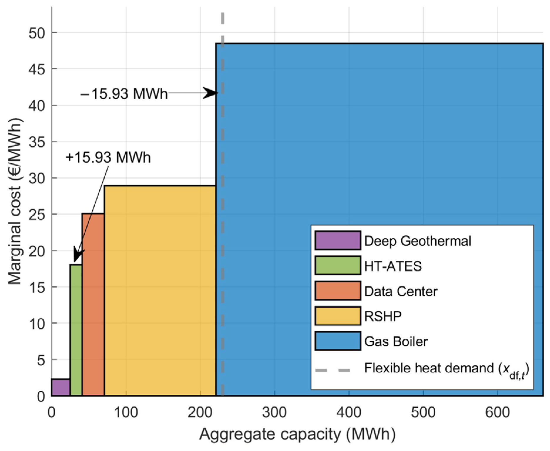 - Discharging: Discharging is triggered after the charging season and when the HT-ATES temperature exceeds the median DHN return temperature. In the run that determines the maximum technically available discharge capacity, discharging depends only on the thermal states of the storage and the network. Economic constraints applied in the LP model then shift storage dispatch through merit-order considerations (Section 2.5).