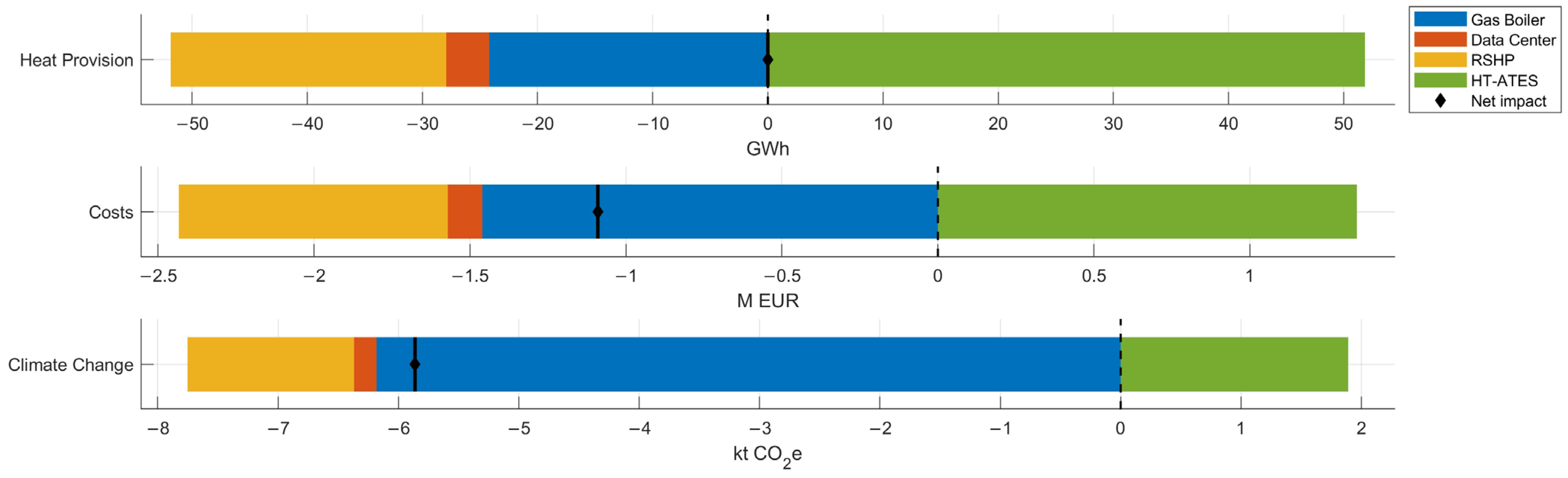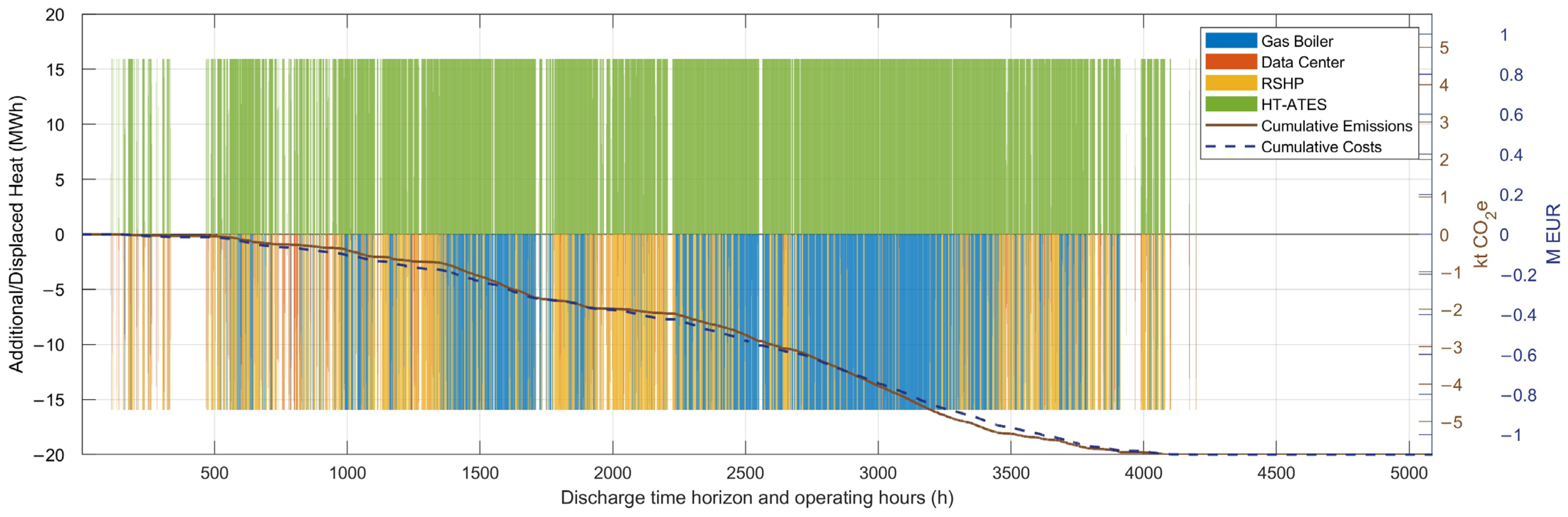 - It integrates a dynamic DHN-HT-ATES model to represent time-dependent technical performance relevant for LCA and economic assessment (notably schedule-dependent losses and capacity constraints).