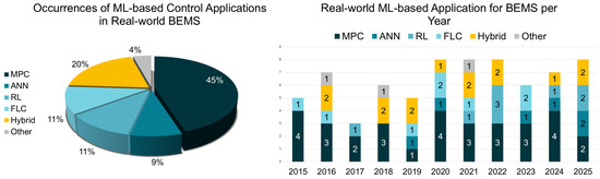 Left: Occurrences of ML-based control applications in real-world BEMS; Right: Real-world ML-based applications for BEMS per year.