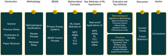 - Section 6: Analyzes the reviewed studies across methodological and practical aspects. Methodological key-attributes concern dimensions as the algorithm design, agent structure, data types baselines control, performance indexes, while practical key-attributes concern implementation features, building type, zone scalability, location, climate and experimental period execution.