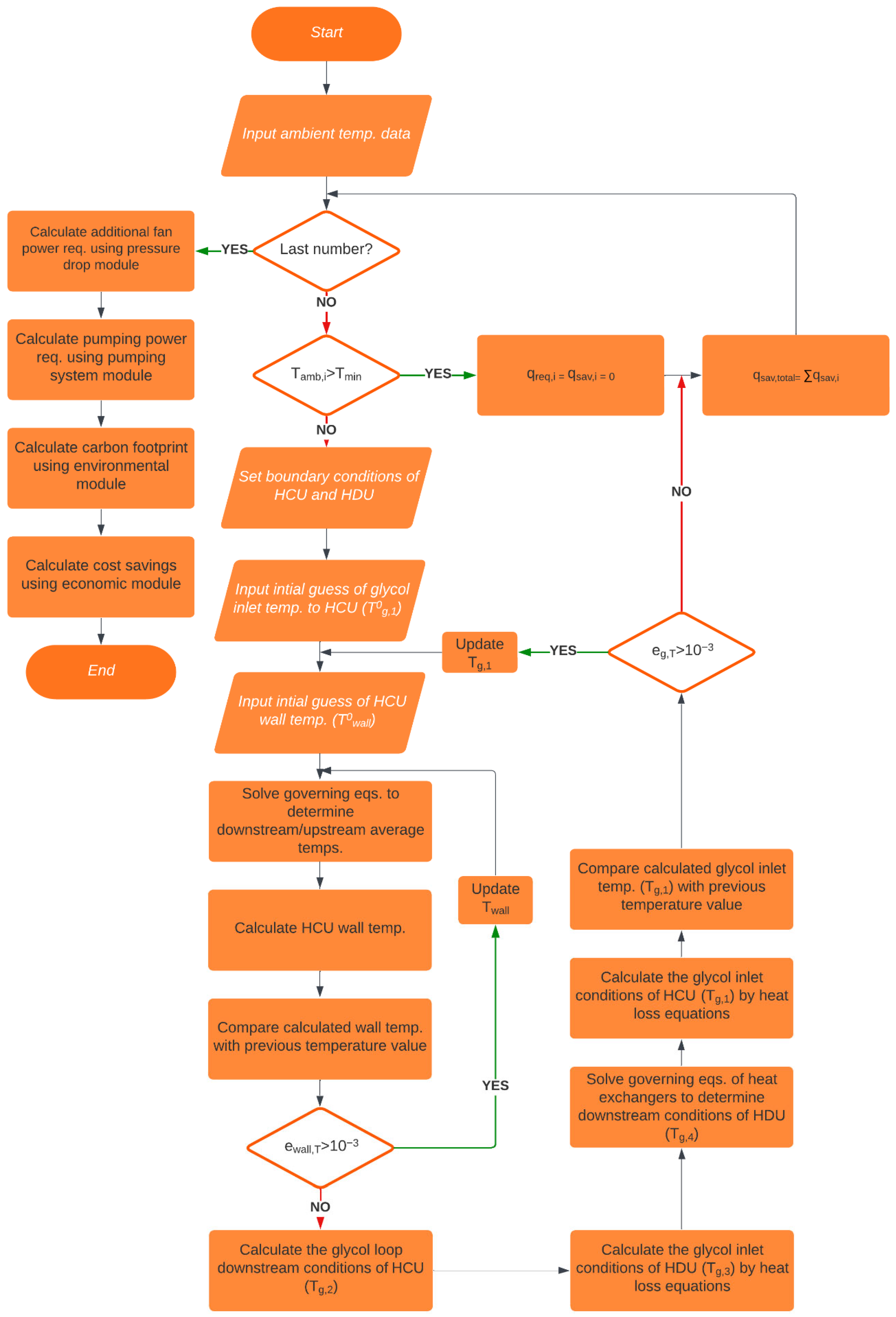 . The procedure repeats until convergence and is executed across the entire ambient temperature record. Full governing equations and parameters are provided in [