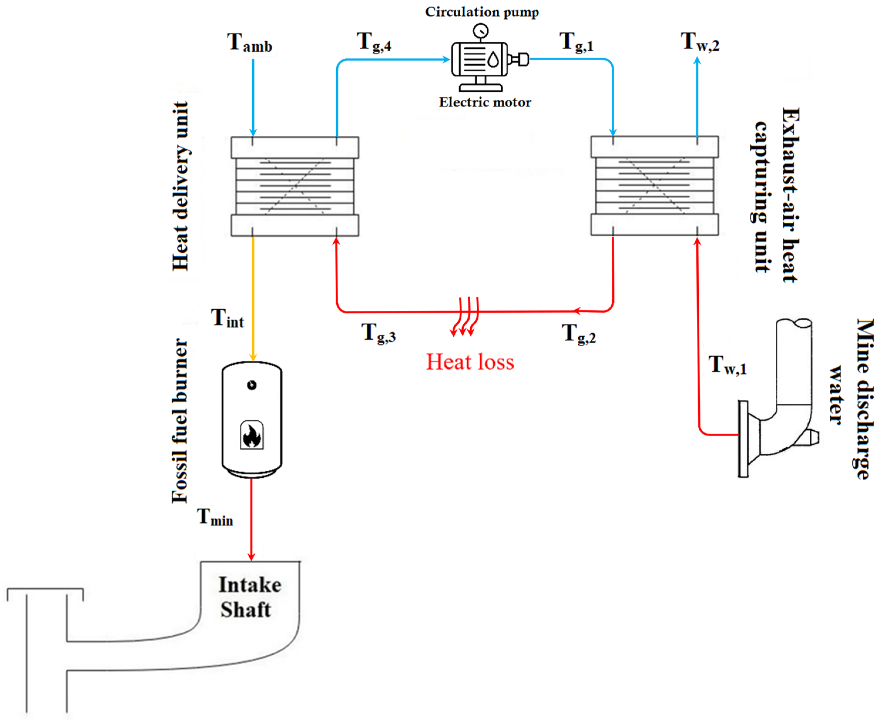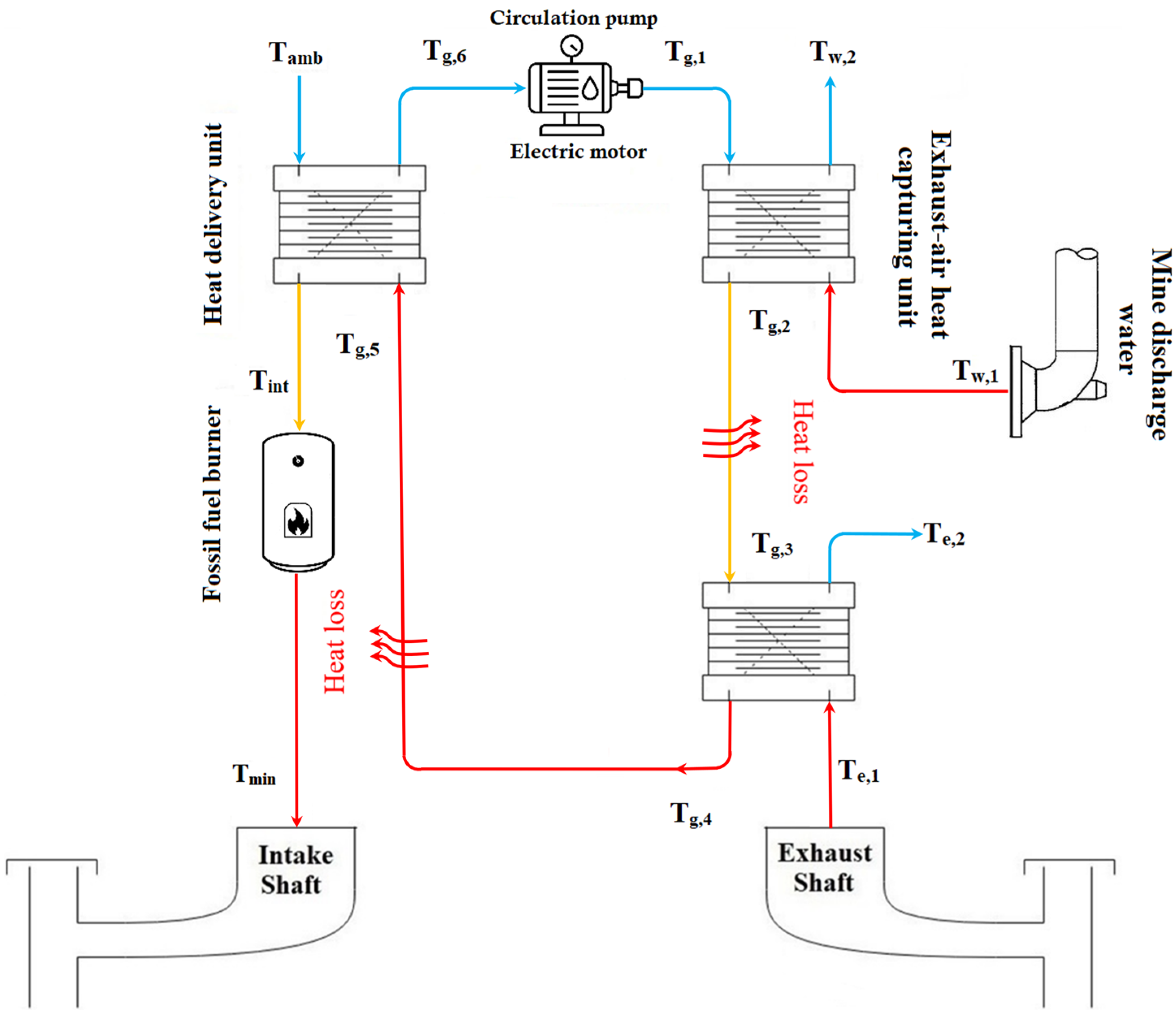 Figure 4 shows the WHR schematic. Mine water transfers heat to an ethylene–glycol loop via a plate heat exchanger at the water outlet; the warmed glycol then pre-heats intake air through a fin-and-tube coil at the intake shaft. Sensors and controlled bypass valves protect the intake coil during low-temperature events to prevent freezing. In very cold conditions, recovered heat may be insufficient, so a fossil-fuel burner supplements the shortfall. The model also accounts for thermal losses along the pipeline linking the two exchangers.