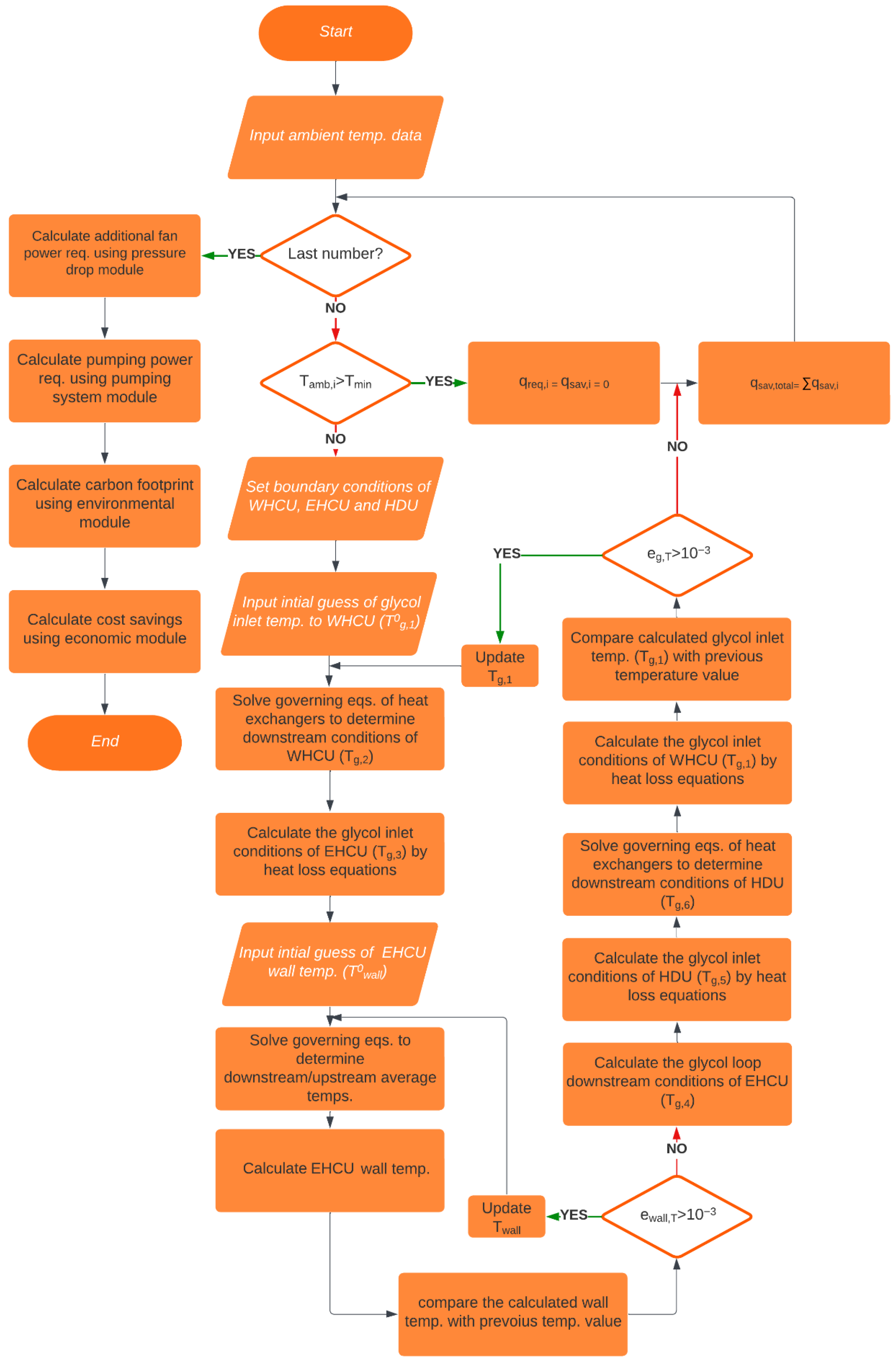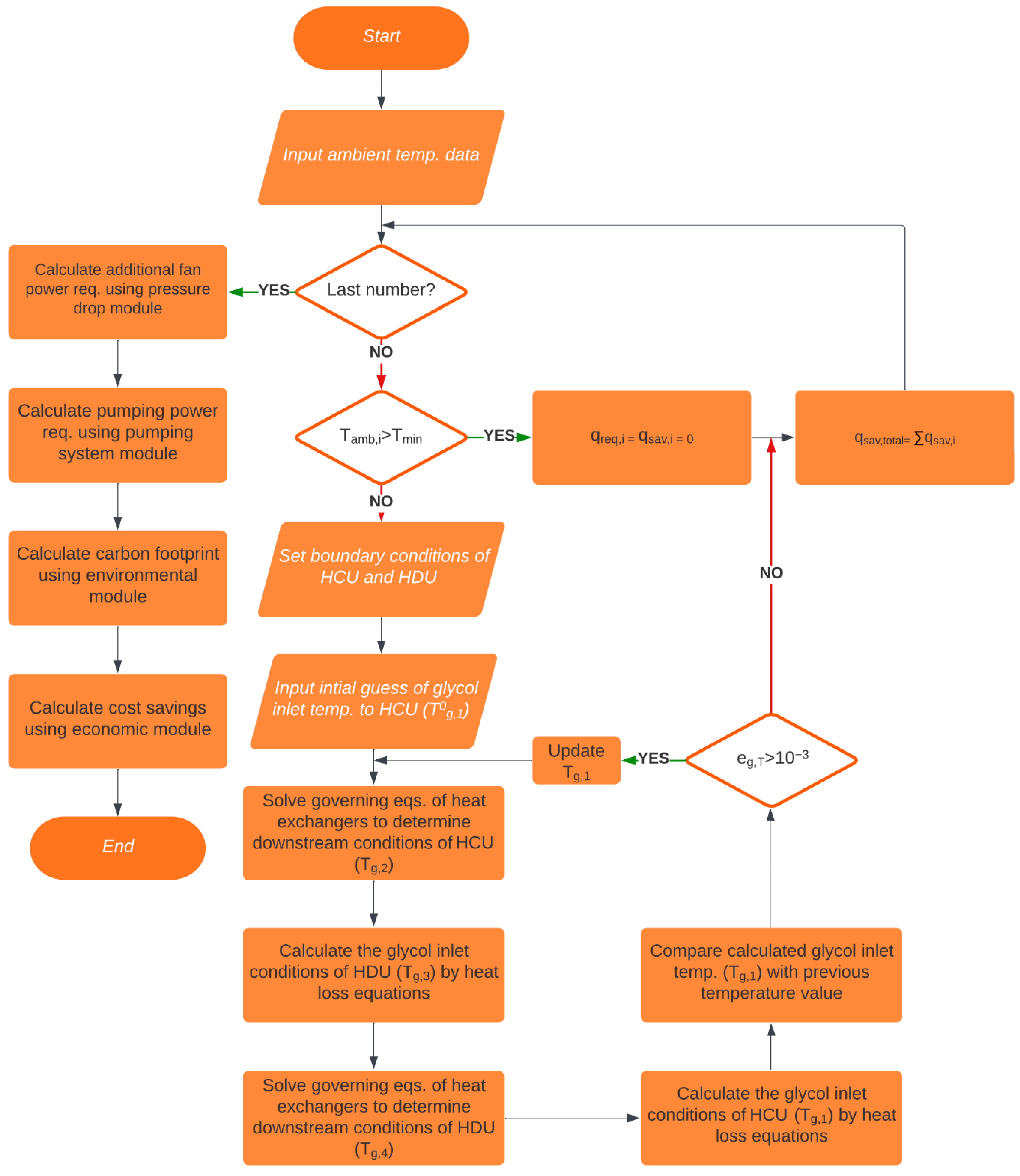 convergence tolerance and the procedure is repeated across the entire ambient record. The model reports recovered heat, intake-air temperature, burner duty, and auxiliary effects (including pressure-loss-induced pumping/fan power). Full governing equations, parameter values, and validation are provided in [