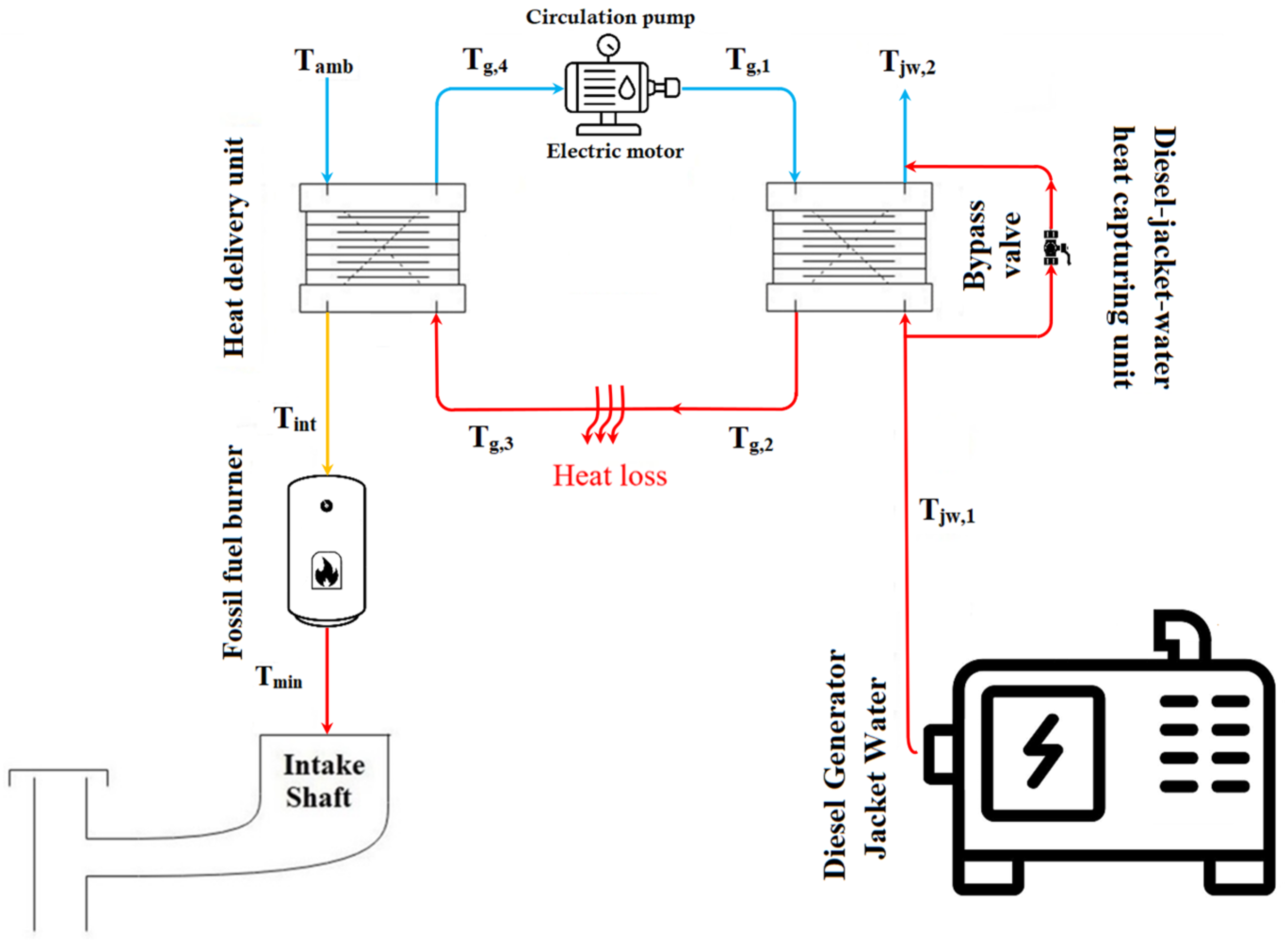 Insufficient Waste Heat Available: If the ambient air is below the minimum intake requirement , and the available captured heat from the heat capture section () is insufficient (), the performance of the system is related to the adjusted temperature difference .