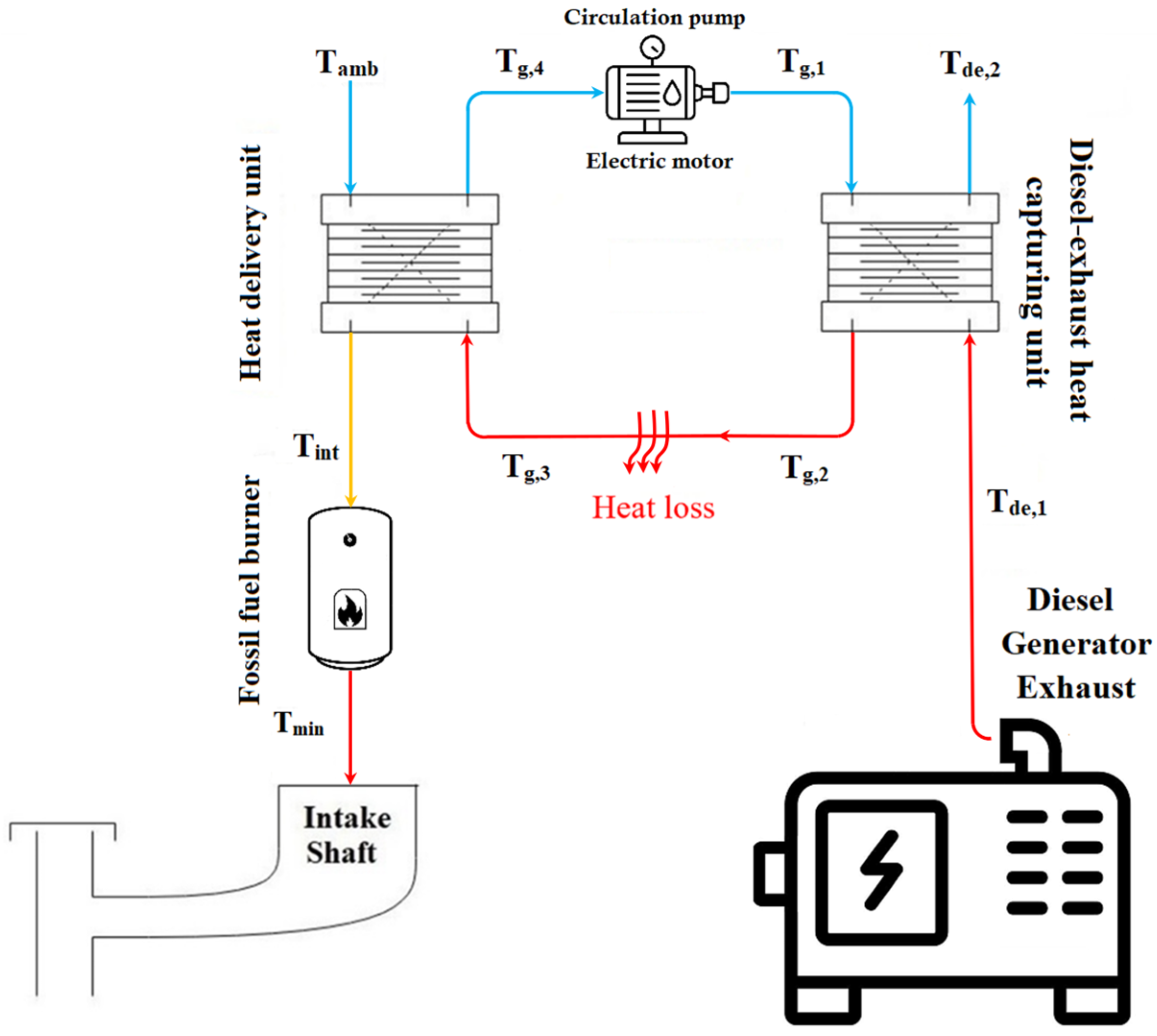 Adequate Waste Heat Available: When the ambient temperature is below the required intake threshold and the heat recovery unit provides enough thermal energy to meet the heating demand (), the savings and performance of the EAHR system depend on the temperature difference ().