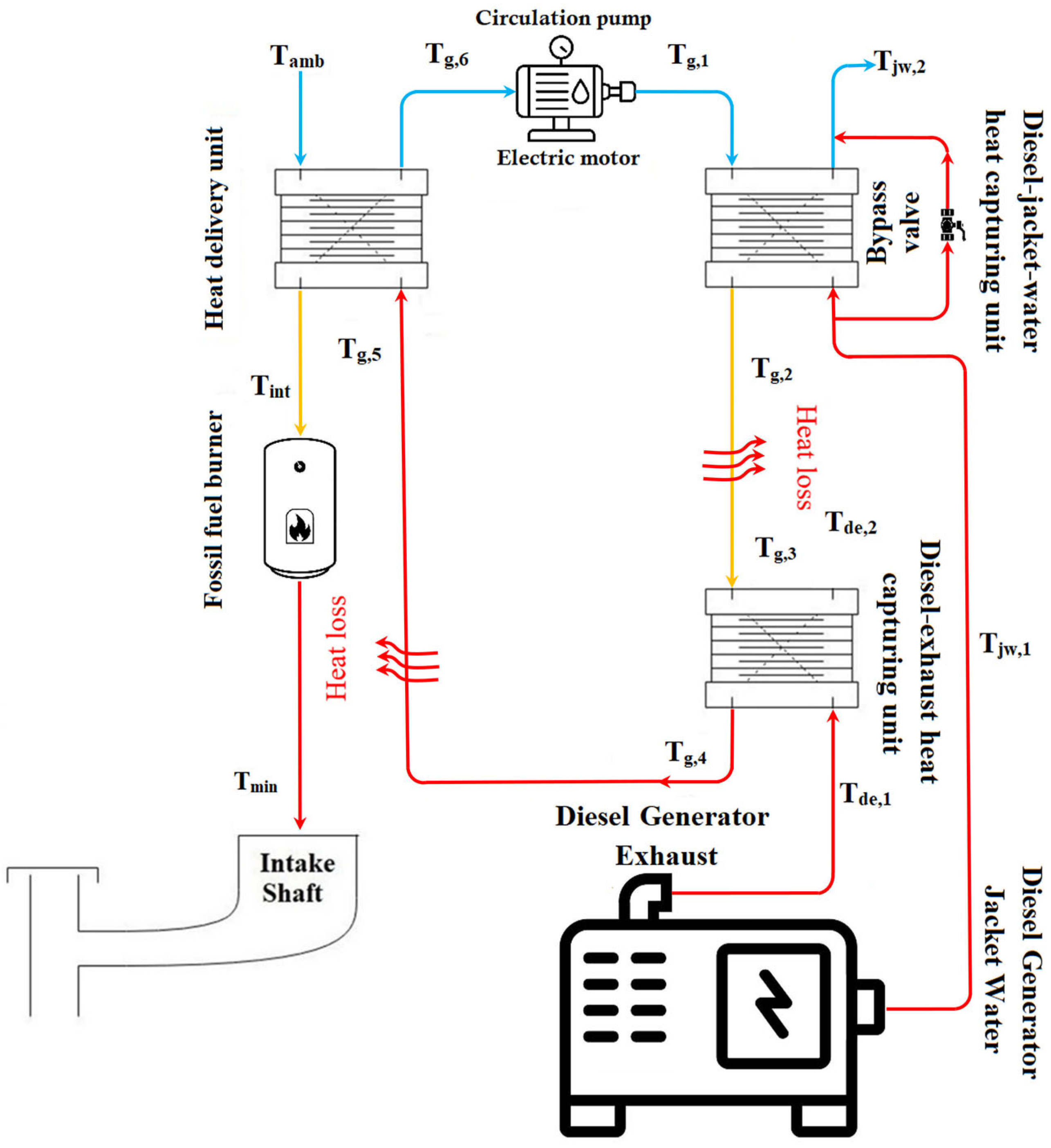 and returns to the capture side to complete the cycle. During very cold periods, recovered heat alone may be insufficient, so a supplementary burner provides the shortfall to maintain the intake setpoint. To prevent frost formation and maintain safe operation on the exhaust-side HX, a bypass valve mixes a portion of hot glycol with the cold stream, keeping the outlet above a prescribed minimum temperature. The model explicitly includes these heat-transfer processes and line-loss effects between shafts.