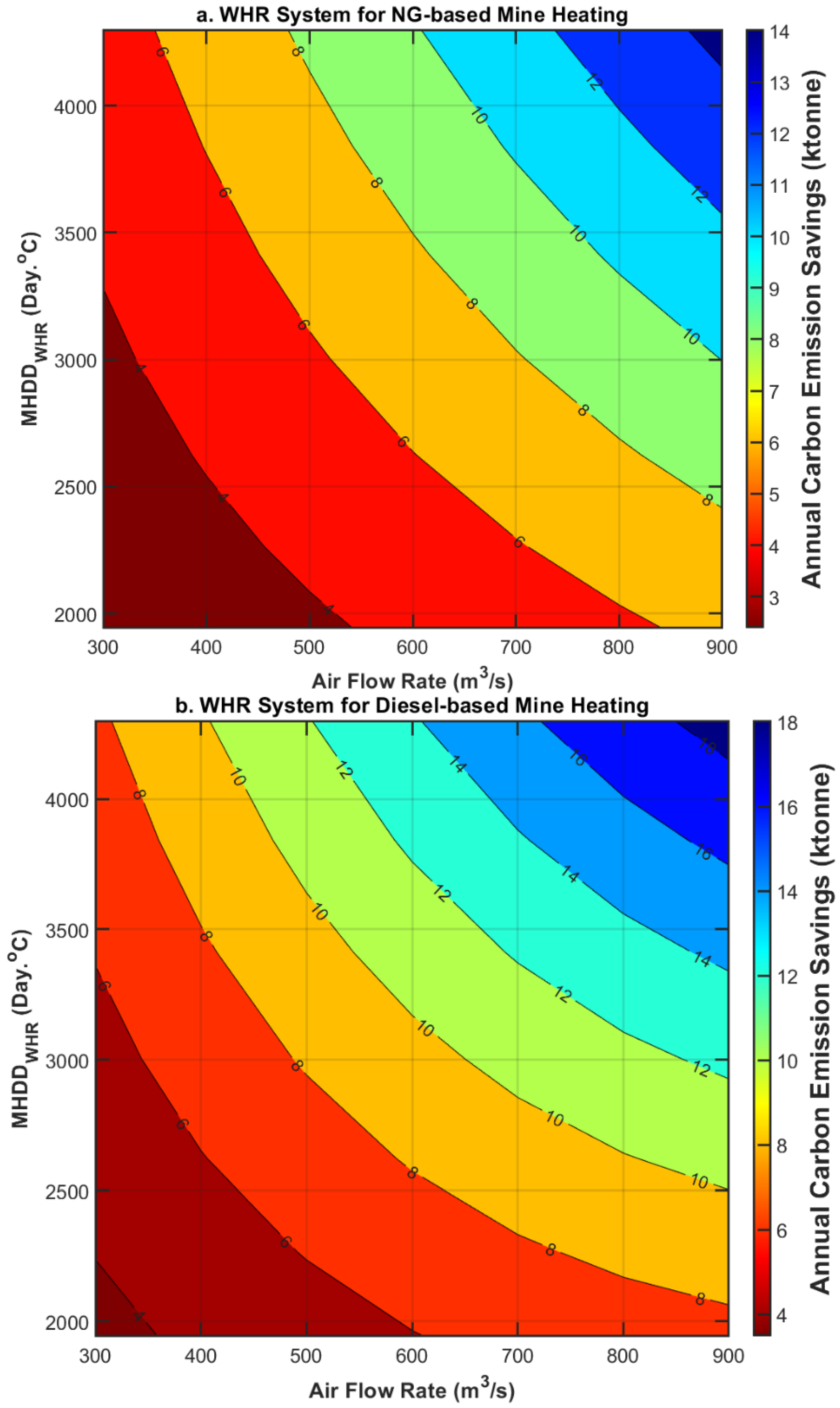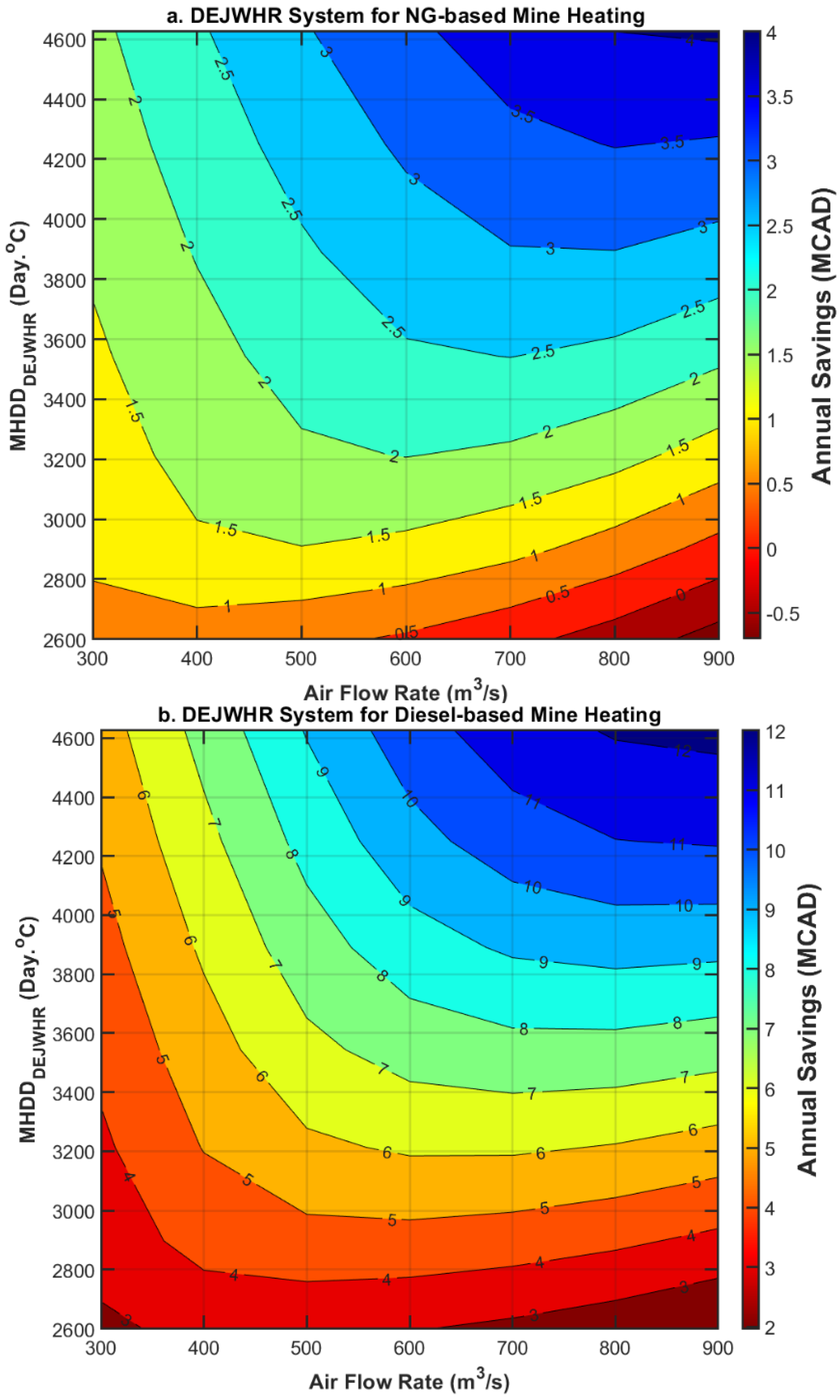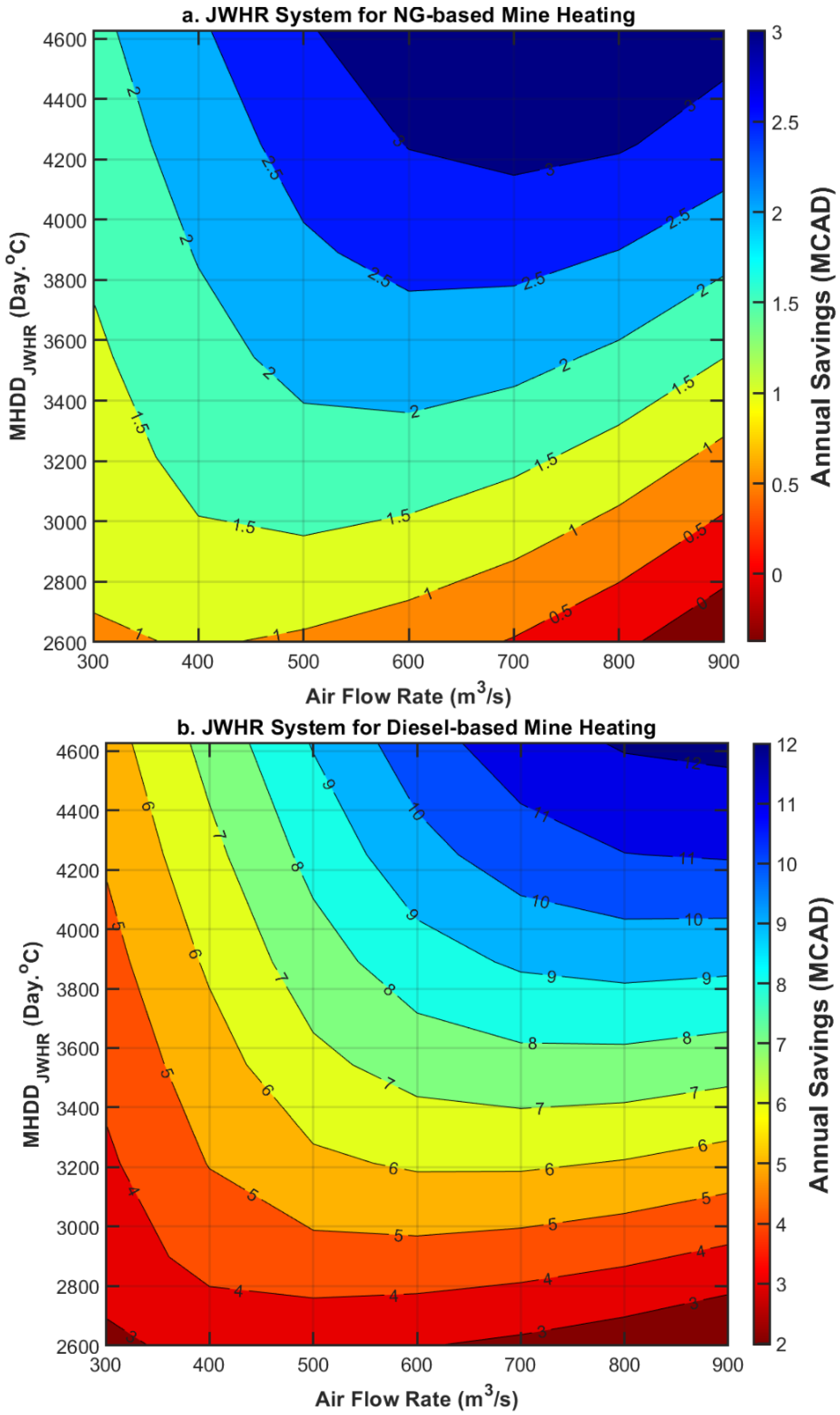 Figure 19a, the analysis assumes that intake air heating is powered by natural gas, with an onsite cost of CAD 13 per gigajoule—reflecting conditions similar to those at the BC mine. In the second scenario (