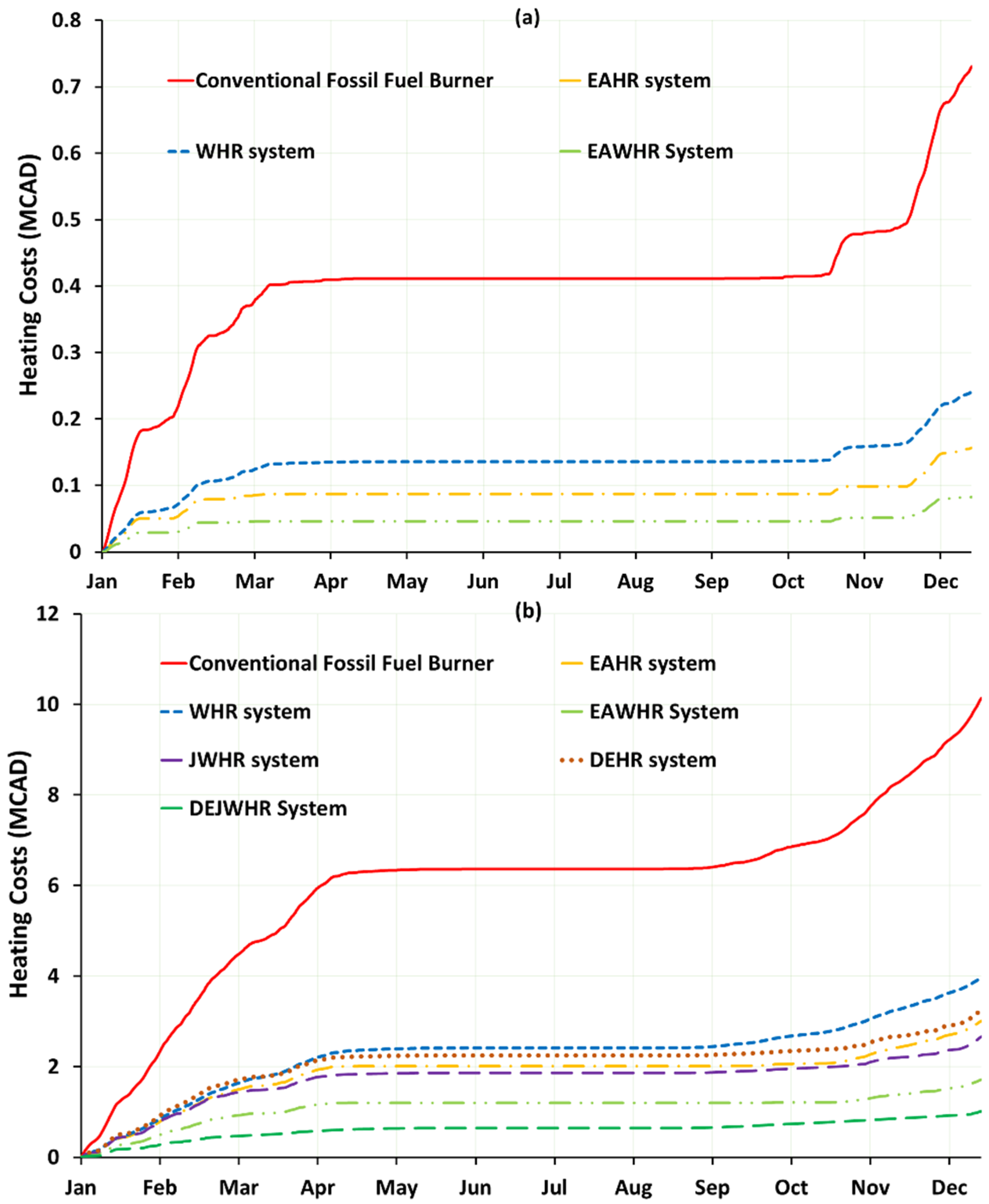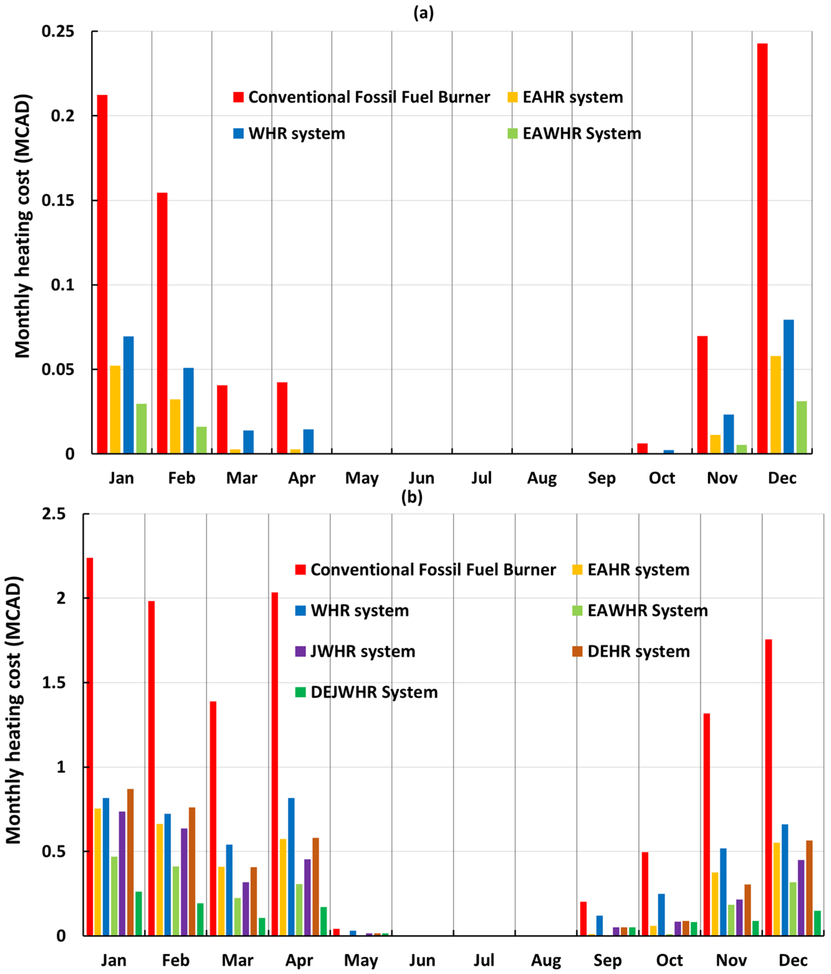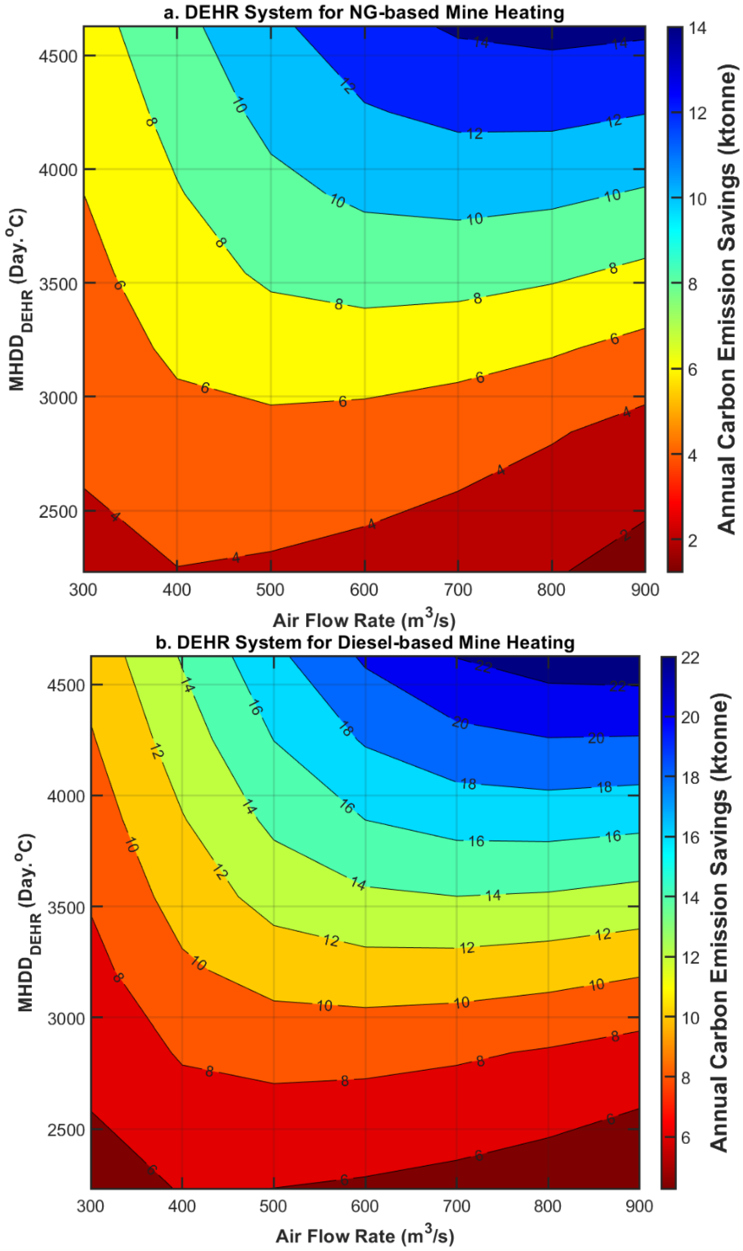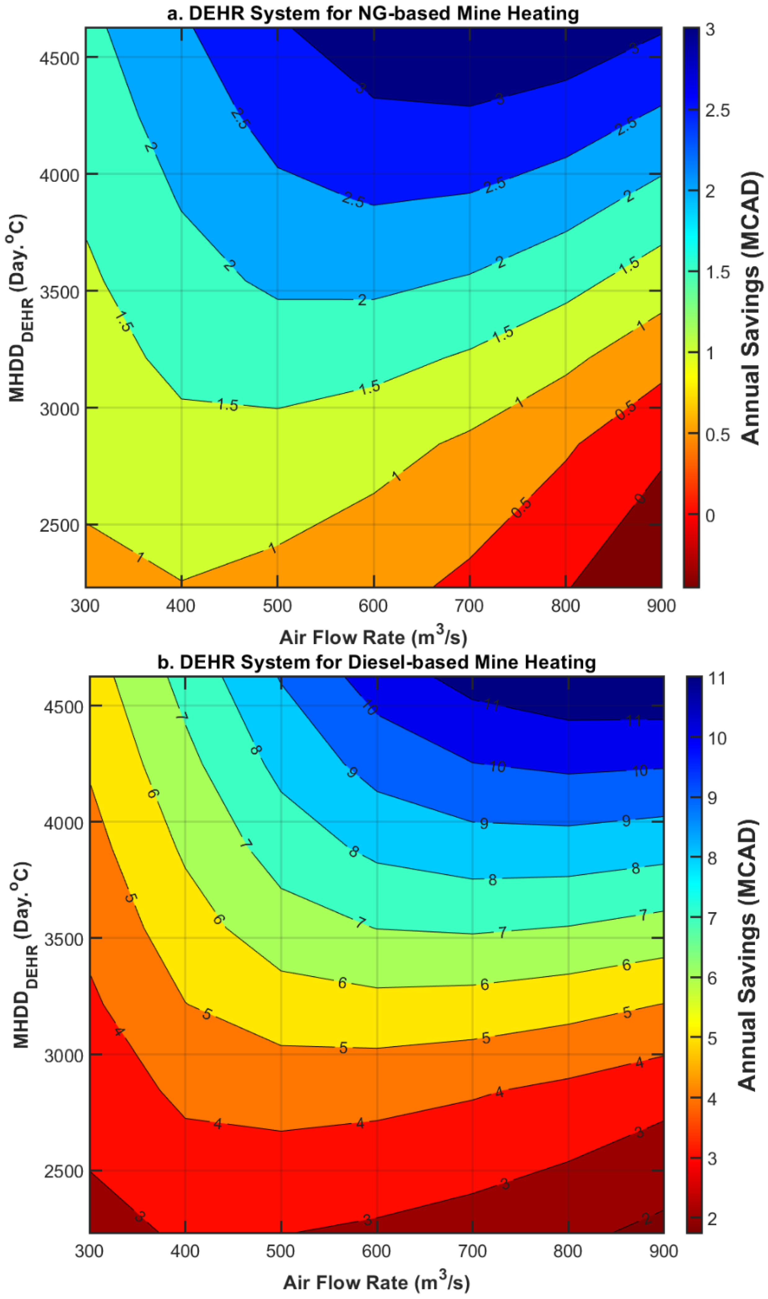 Figure 19a, the analysis assumes that intake air heating is powered by natural gas, with an onsite cost of CAD 13 per gigajoule—reflecting conditions similar to those at the BC mine. In the second scenario (