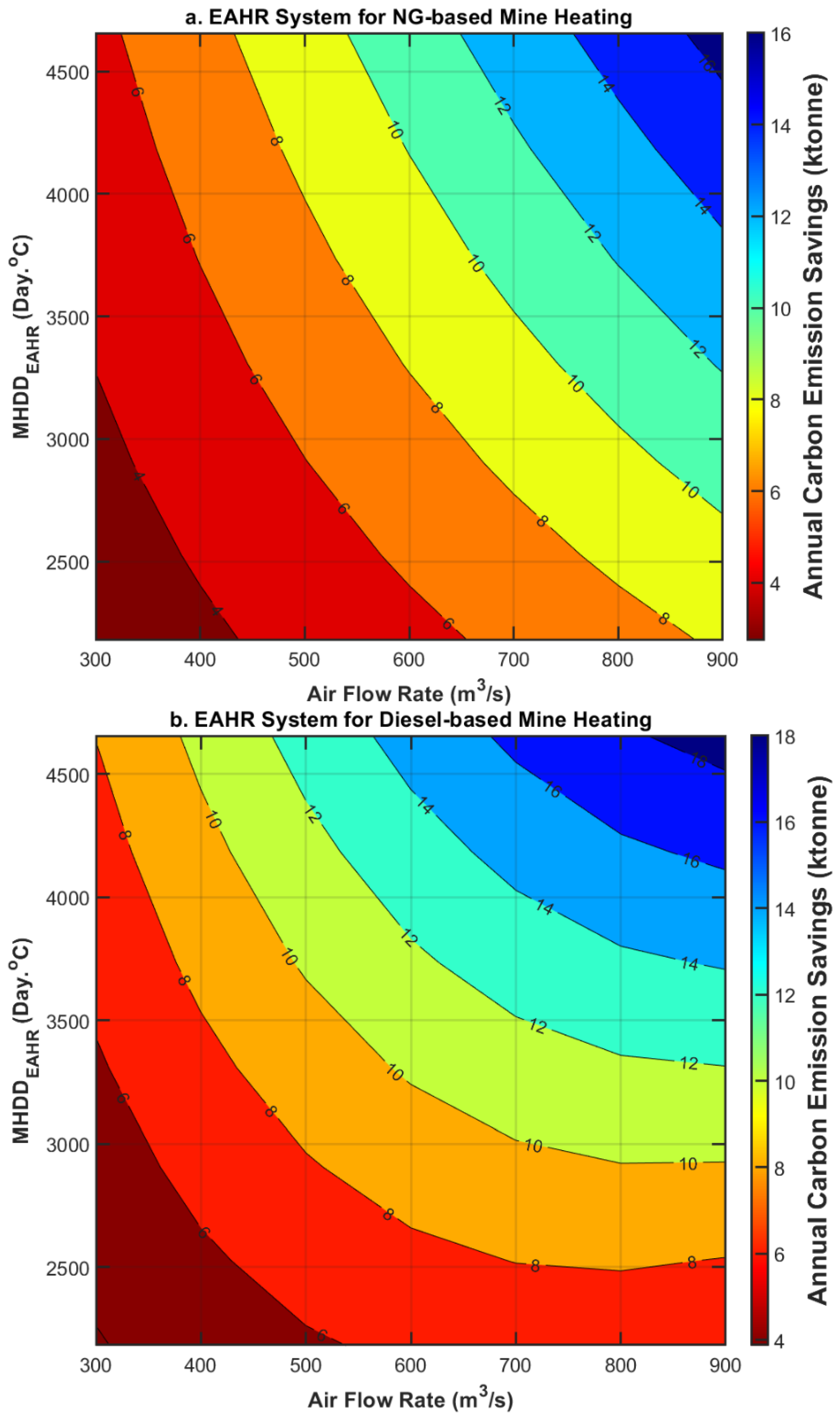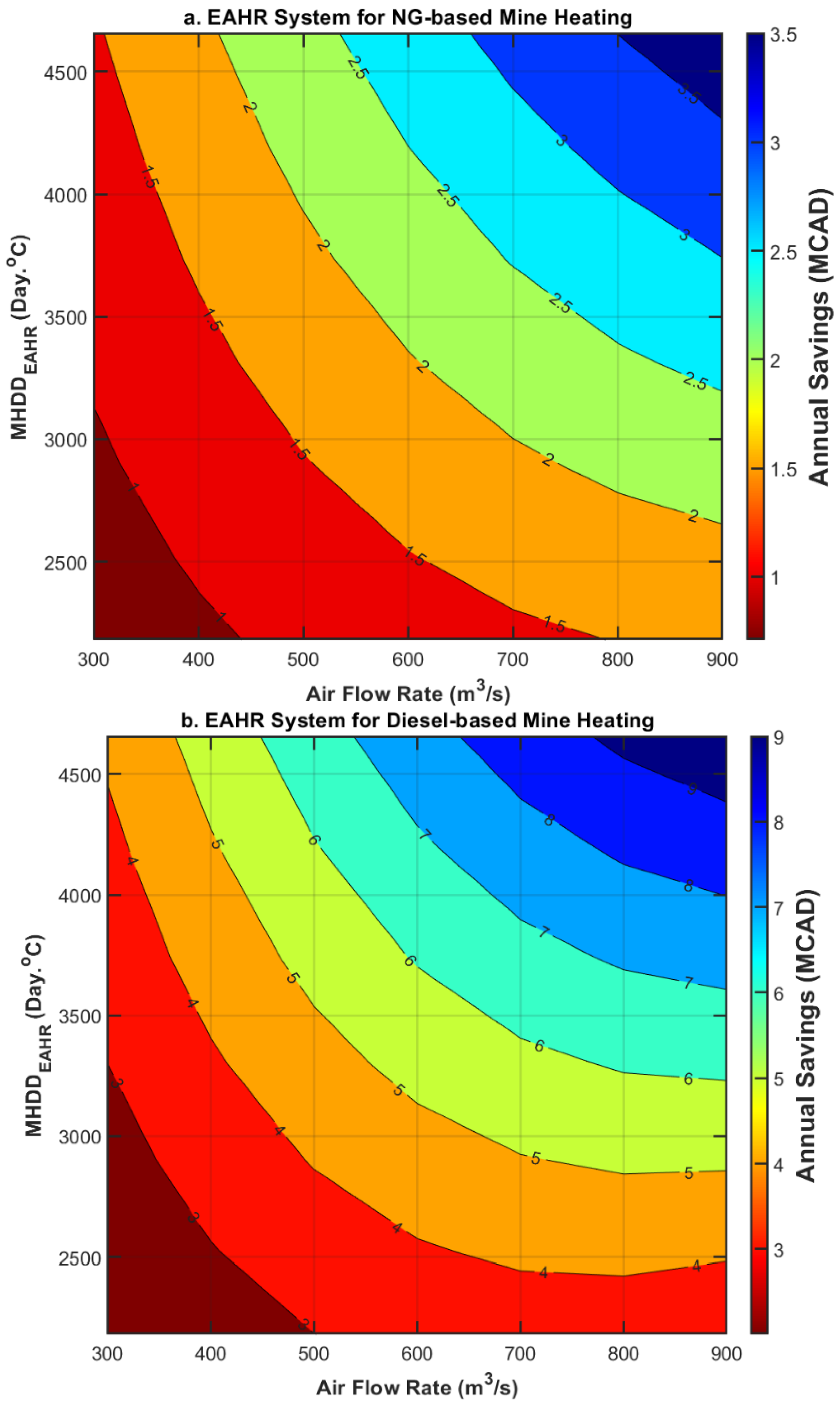 MHDDEAHR and ventilation needs can achieve notable savings in heating costs by adopting the EAHR system especially in off-grid locations where diesel is predominantly used for heating. Considering the system’s capital cost, which typically falls below CAD 2 million, it can repay its investment within the mine’s lifespan of 10–20 years, even for sites with minimal ventilation demands. The findings provide practical guidance for engineers and stakeholders aiming to integrate exhaust heat recovery technologies into mining operations.