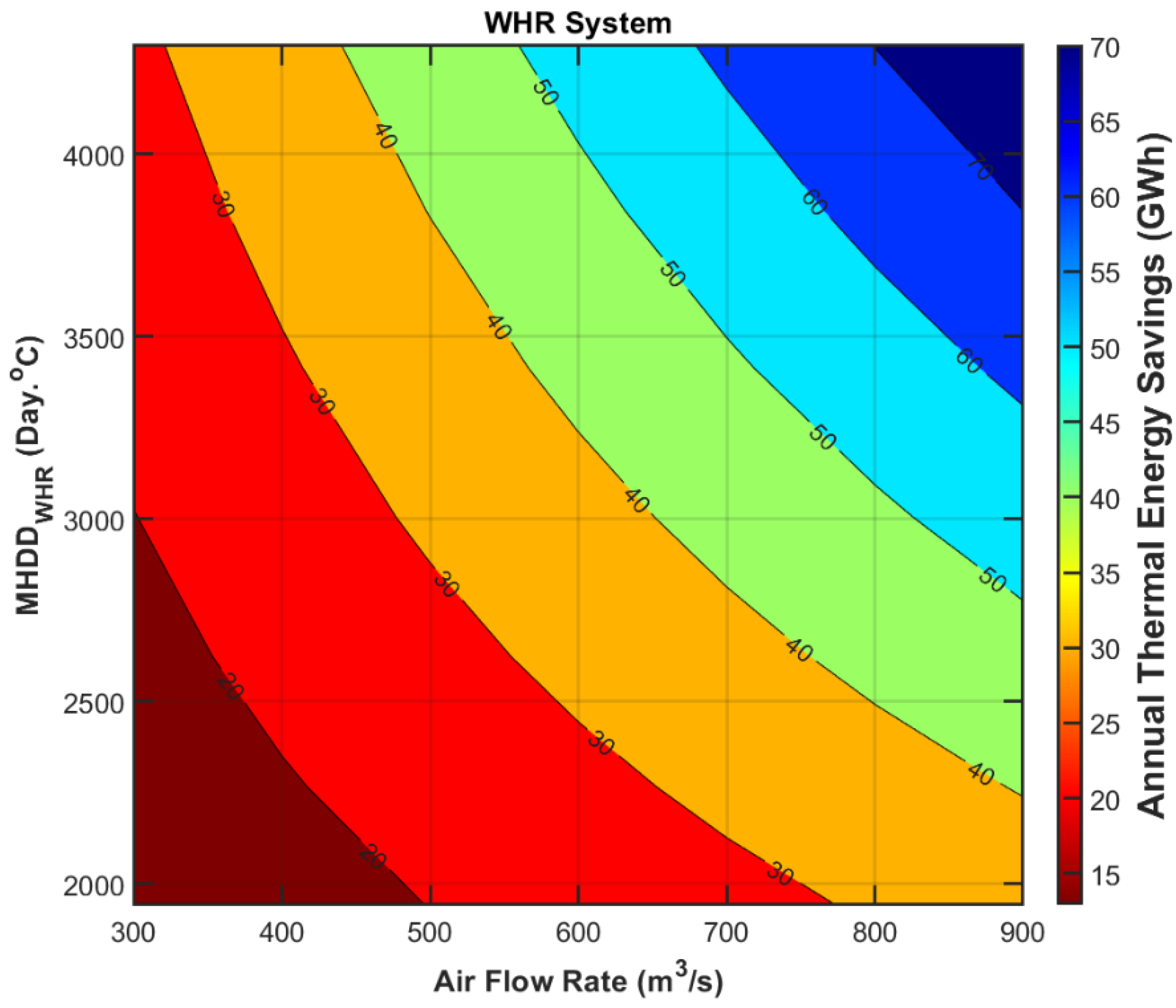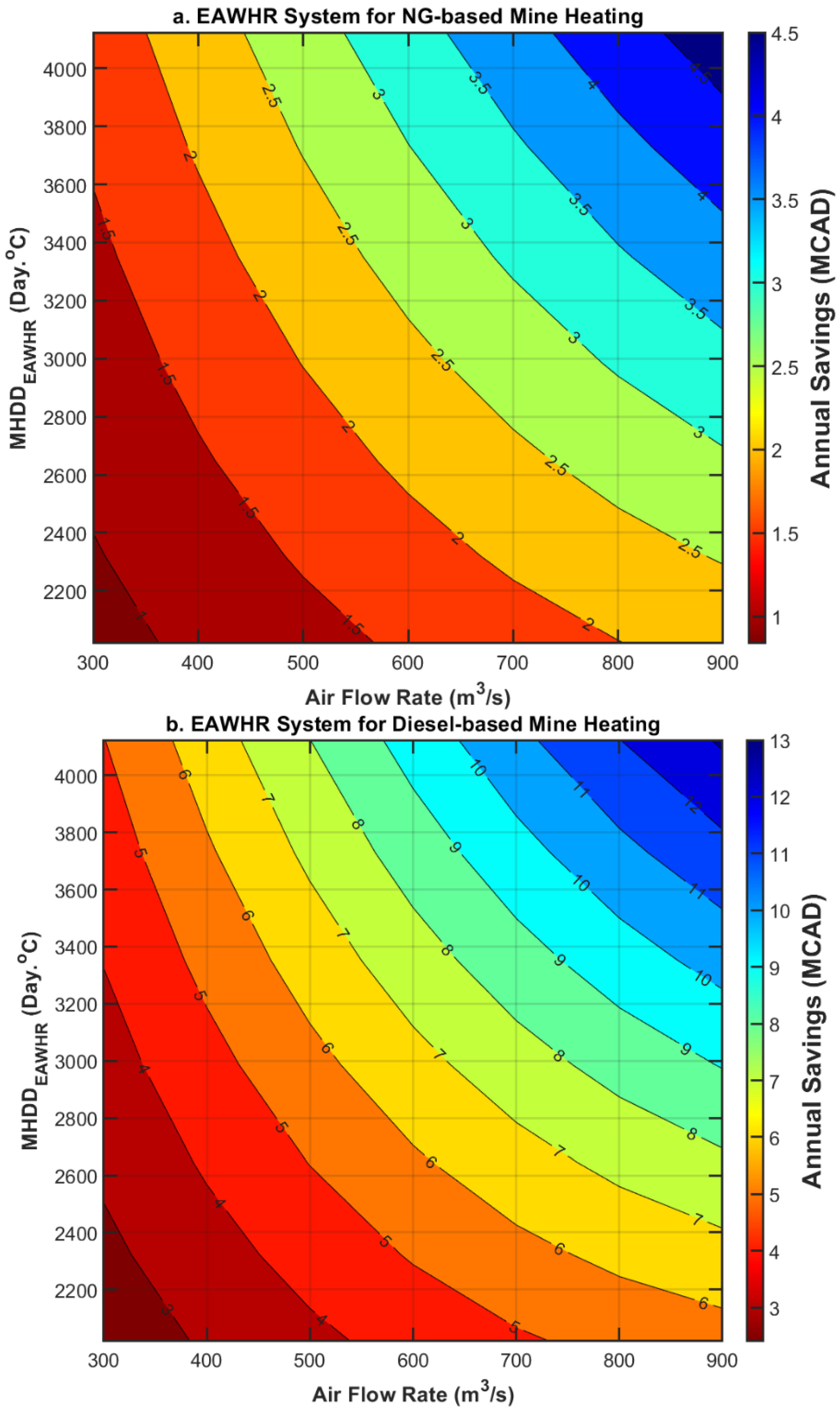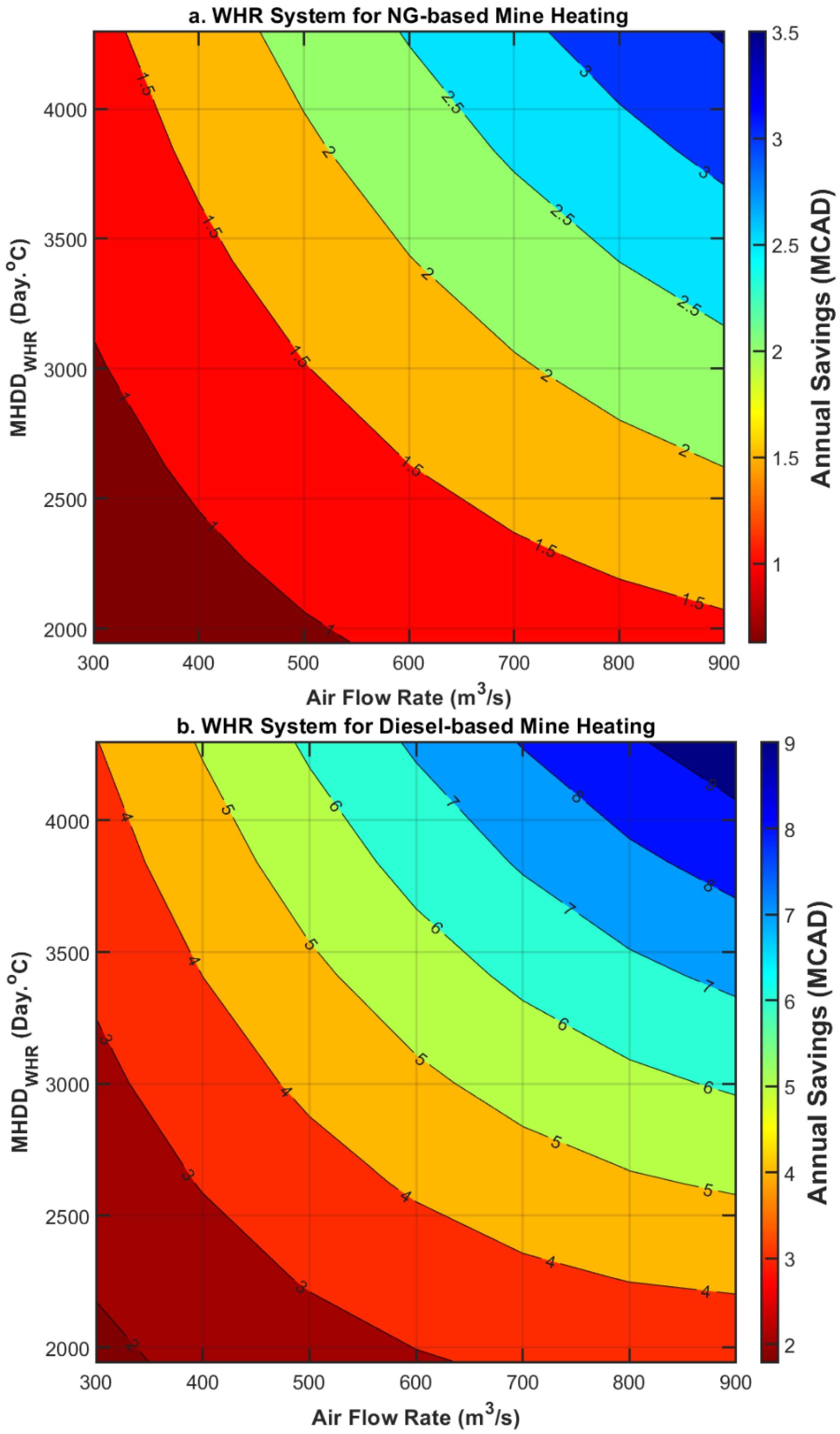 MHDDWHR values result in greater energy savings. This trend underscores the economic advantage of implementing the WHR system in mines with higher air flow rates and