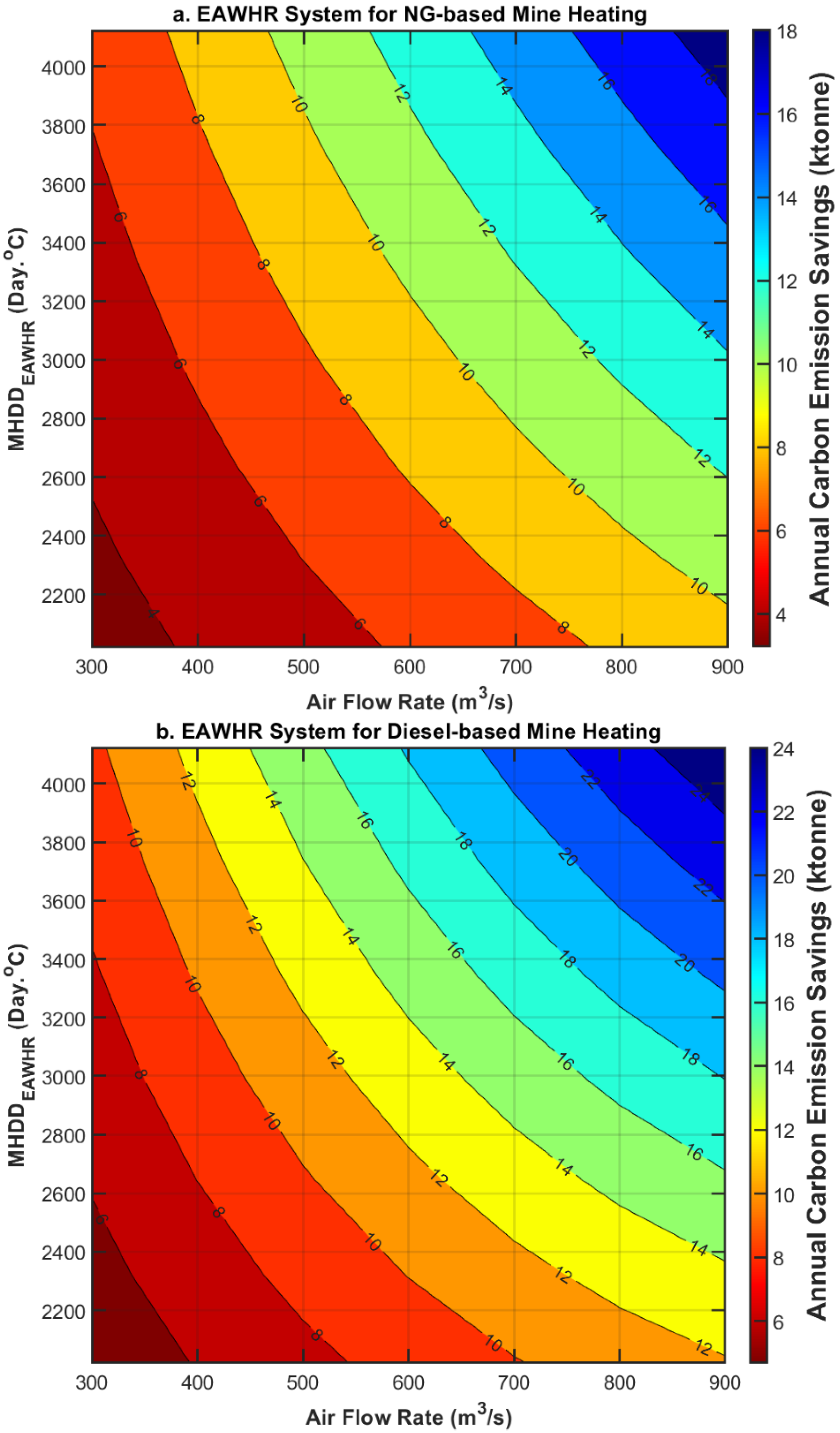 Figure 20 presents an approximate calculation of carbon reductions achieved by the EAHR system in various mining operations, considering two key factors: mine intake air flow rate and