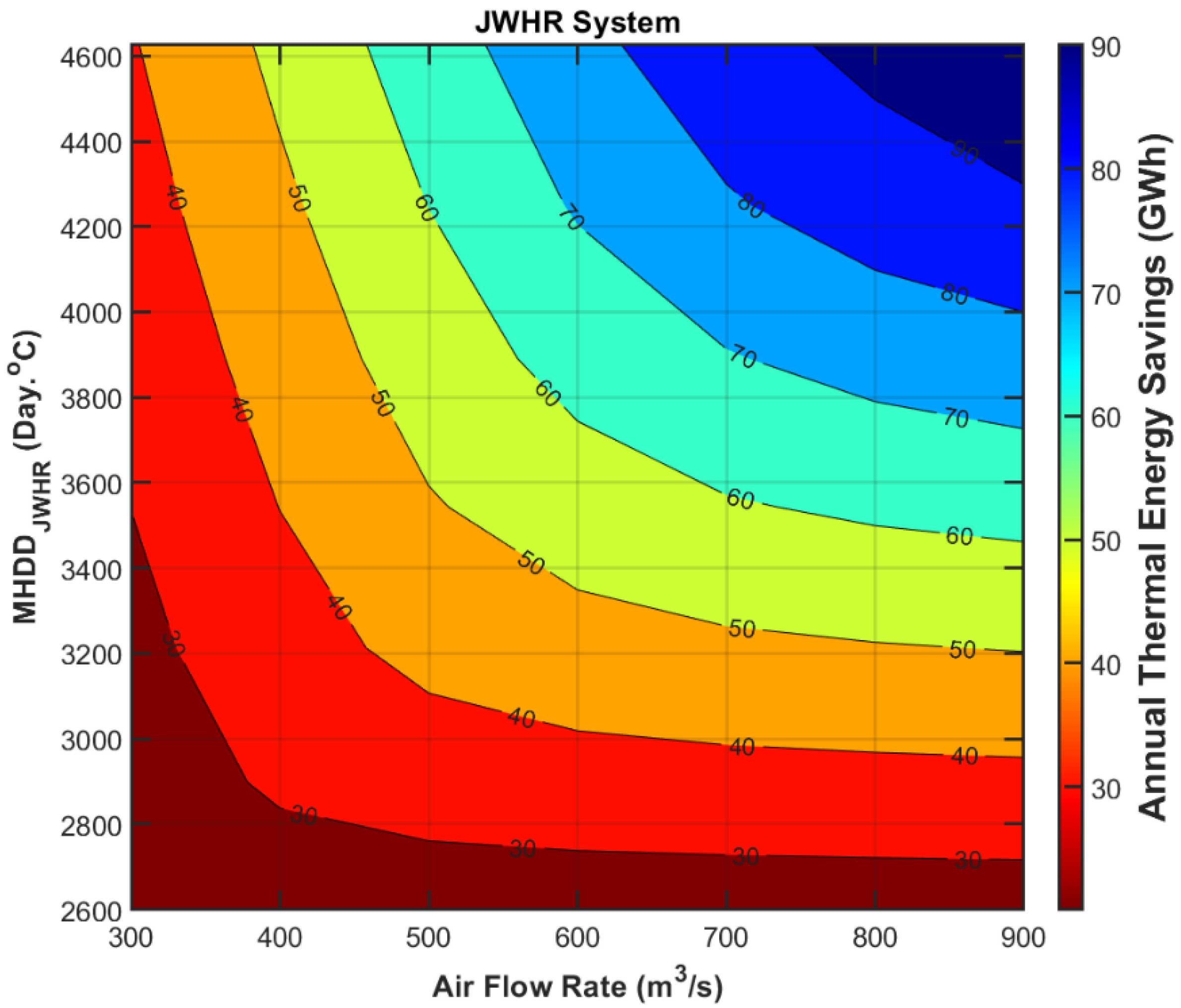 MHDDJWHR values ranging from 2600 to 4600 °C and air flow rates between 300 and 900 m