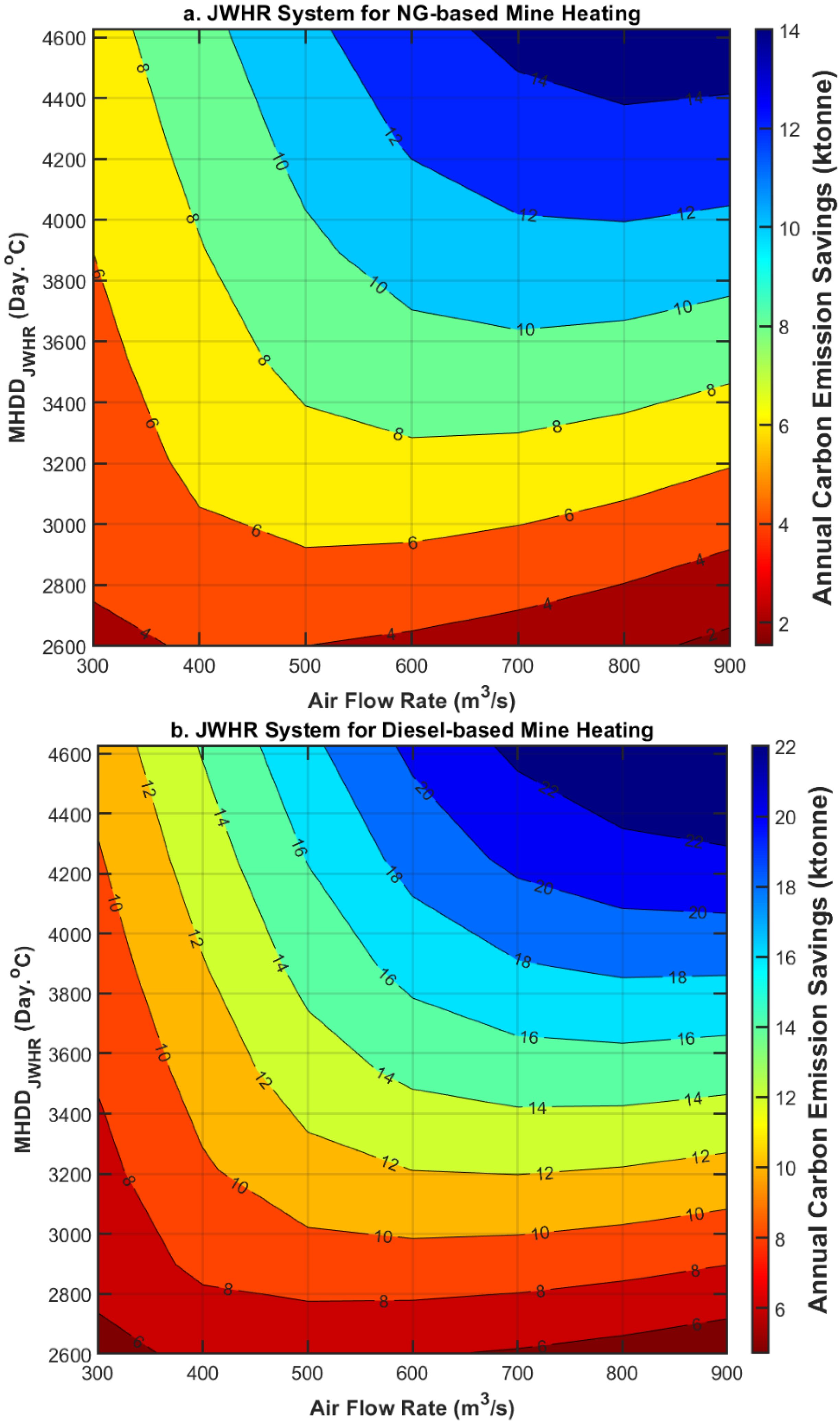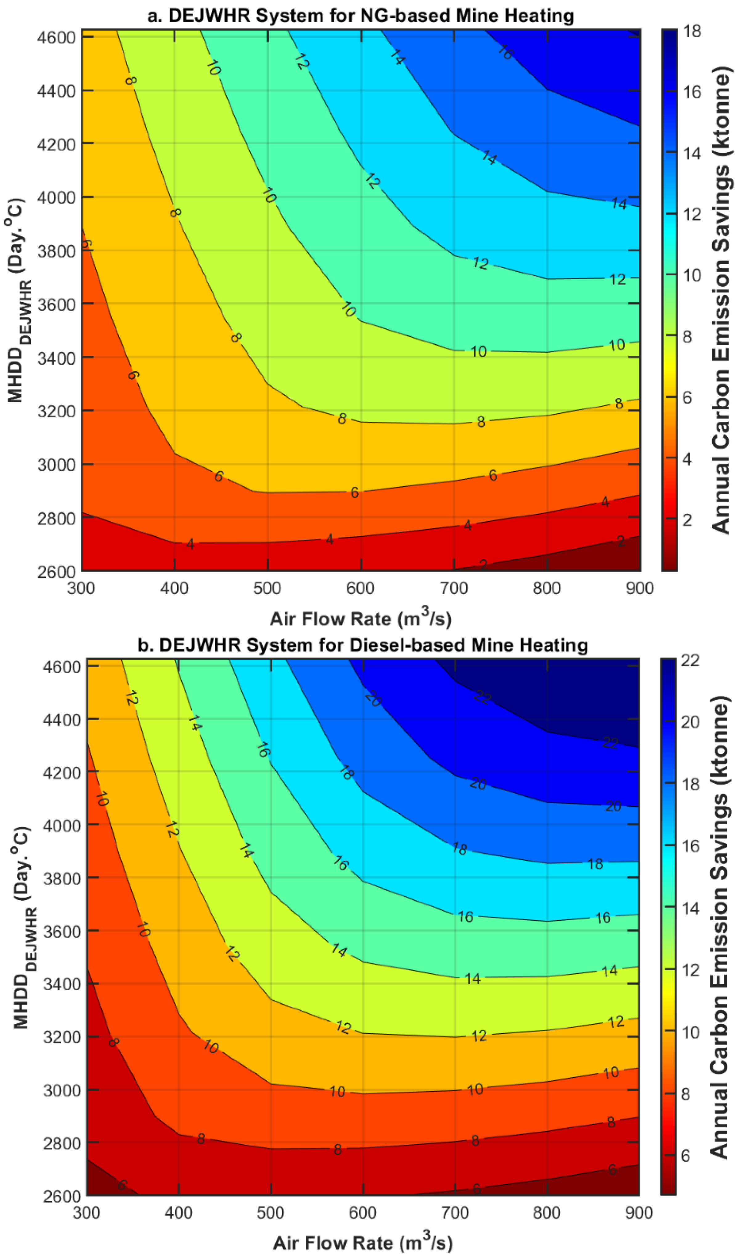 MHDDJWHR, mine airflow rate, and fuel type with the data provided. It is important to note that the impact of extra fan power is similar to its effect on cost savings. As ventilation demand increases, the electric power required to overcome the resistance from heat recovery units also rises. Since this electricity is supplied by diesel generators, which produce considerable carbon emissions, higher ventilation demand leads to increased emissions.
