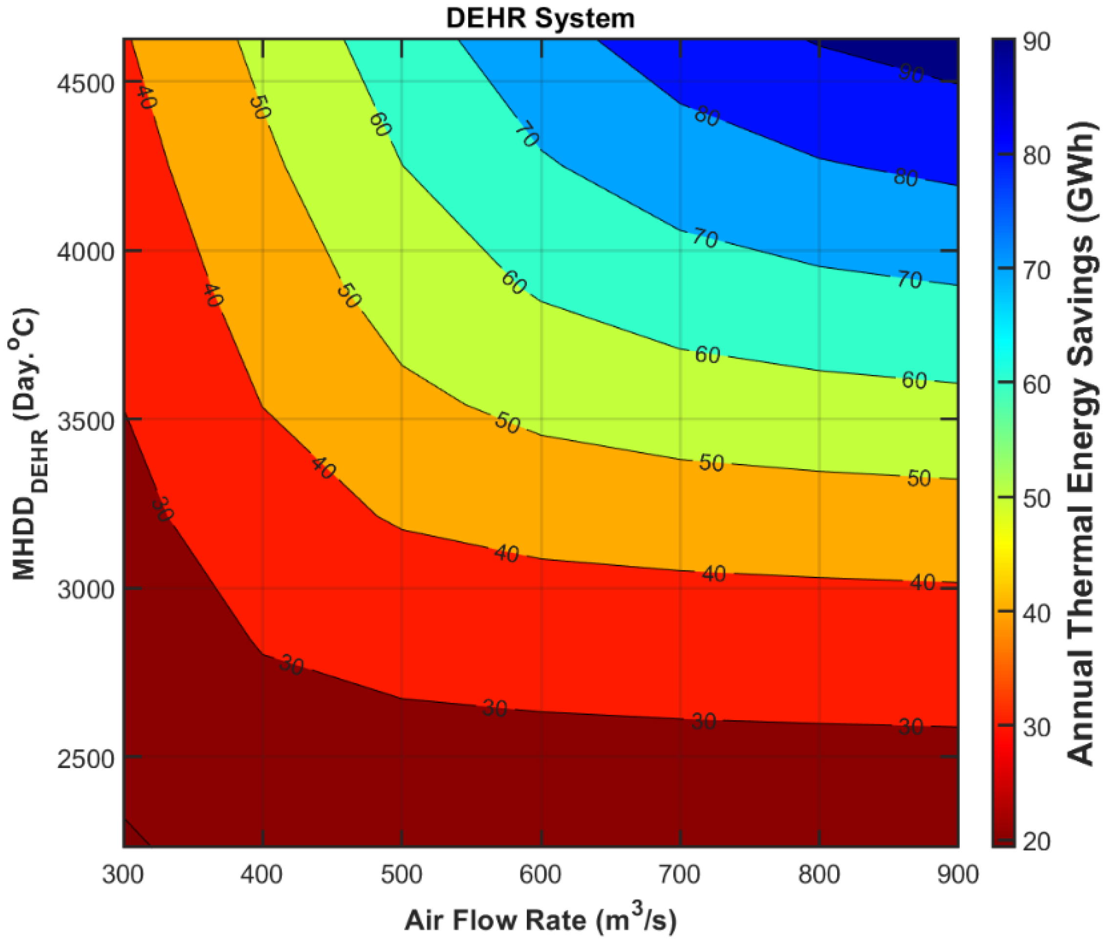 MHDDDEHR values ranging from 2400 to 4500 °C and air flow rates between 300 and 900 m