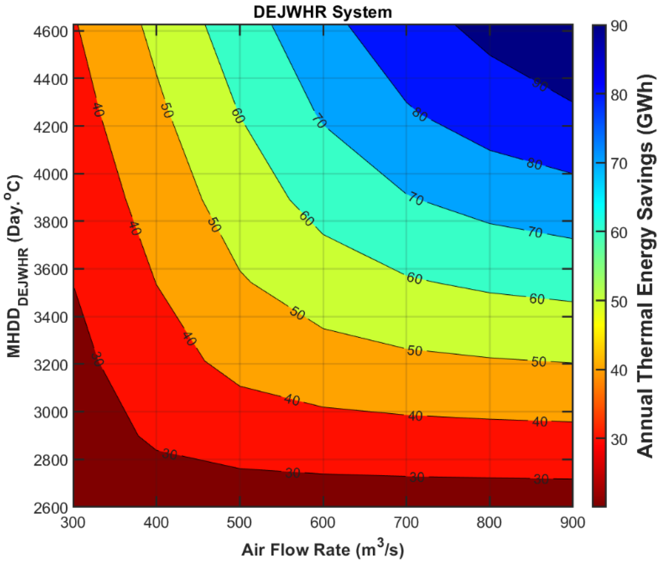 MHDDDEJWHR values ranging from 2600 to 4600 °C and air flow rates between 300 and 900 m
