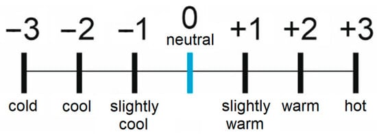 Thermal comfort can be assessed using the PMV (Predicted Mean Vote) index, which evaluates thermal sensation on a seven-point scale [22]. The scale is shown in Figure 1, where “0” represents comfort conditions most favorable for occupants in terms of thermal comfort. Thermal comfort can also be evaluated using the PPD (Predicted Percentage of Dissatisfied) index, which estimates what share of the population will feel dissatisfied with the prevailing thermal conditions in a given environment. Standard [23] defines several categories of indoor environment, with recommended ranges presented in Table 1. The indoor thermal comfort level, according to Fanger’s scale, is determined based on microclimate parameters such as air temperature, mean radiant temperature, air velocity, and relative humidity. Additionally, two human-related factors are required for the calculations: clothing insulation level and metabolic rate [24].