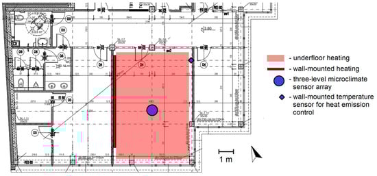 Two types of low-temperature surface heating systems were analyzed in the study: underfloor and wall-mounted (hereafter referred to as wall heating). Both are hydronic systems supplied from the building’s water-based energy storage, which is charged by a system of air-source heat pumps (ASHPs). Heating pipes were arranged in meandering coils with 0.15 m spacing and embedded either in the screed layer beneath ceramic tile flooring or incorporated into the walls as a wall-mounted system. Each local room distributor was equipped with a pump–mixing unit consisting of a circulation pump, a control valve with an actuator, and both temperature and dew point sensors (the latter preventing moisture accumulation on the surfaces during cooling mode) on the supply side of the surface heating system.