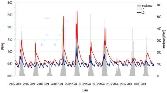 The second measurement cycle similarly aimed to assess the indoor microclimate and thermal comfort conditions, this time during the operation of the wall heating system (see Figure 5). Under these conditions, the PMV values in Room L1 ranged from 0.25 to 2.84, and from 0.15 to 1.02 in Room L2. Consistent with the observations for the underfloor heating system, solar exposure triggered a stronger PMV response in Room L1, resulting in a noticeably greater amplitude of variation compared to Room L2.