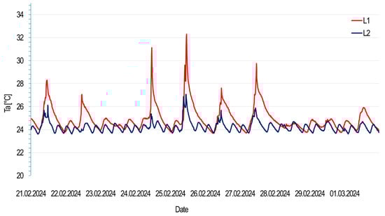 Air temperature (Ta) in rooms L1 and L2 at a height of 0.6 m during underfloor heating operation.