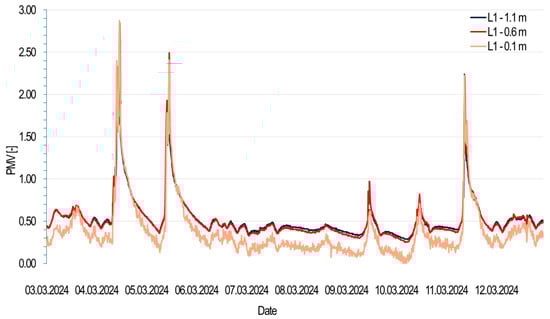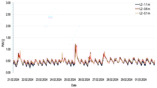 During the experiment, data were also collected from sensors positioned at 1.1 m (head level for a seated person) and 0.1 m (feet level). To investigate how the thermal comfort index varies with height for both surface heating systems, the PMV time profiles from the room without blinds (L1) and the room with blinds (L2) were compared across all measurement levels. The results are presented separately for the underfloor heating system (Figure 6 and Figure 7) and for the wall heating system (Figure 8 and Figure 9).