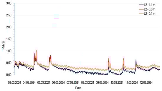 PMV values in room L2 at a height of 0.1 m, 0.6 m and 1.1 m, during wall heating operation.