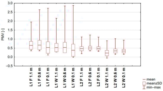 Both the reference mean PMV and the mean whole-body PMV values (see Table 5) were higher in Room L1 than in Room L2 for both types of surface heating systems. For underfloor heating and wall-mounted heating, the values in Room L1 were 0.67/0.62 and 0.53/0.49, respectively, while in Room L2 they reached 0.53/0.49 and 0.34/0.31, respectively. This trend is consistent with the air temperature recorded at the reference height of 0.6 m, where higher values were observed in Room L1 (24.93 °C and 24.44 °C) compared to Room L2 (24.24 °C and 23.58 °C)—see Table 5.
