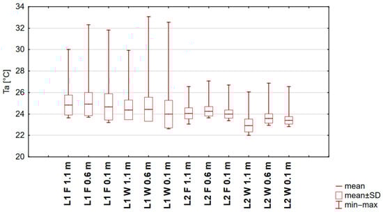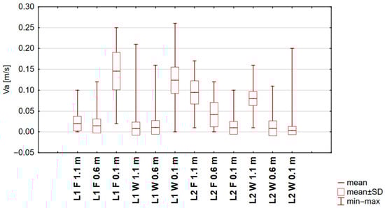 Table 4 summarizes the descriptive statistics of the selected microclimate parameters recorded during the experiment. Figure 10, Figure 11 and Figure 12 illustrate the distribution of the following variables at three measurement heights in both rooms and for both heating systems: PMV values (Figure 10), air temperatures (Figure 11), and air velocities (Figure 12). Regardless of the room type and heating system, the average PMV values were consistently highest at the middle measurement height, corresponding to the center of gravity of a seated person. This pattern was also reflected in the mean, maximum, and minimum air temperature values. Furthermore, PMV values in Room L1 showed considerably higher variability than in Room L2 at all three measurement heights for both the underfloor heating system (L1: SD = 0.22–0.32, L2: SD = 0.09–0.12) and the wall heating system (L1: SD = 0.24–0.34, L2: SD = 0.10–0.15). In contrast, within each room, the variability of PMV did not differ significantly between the two heating systems.