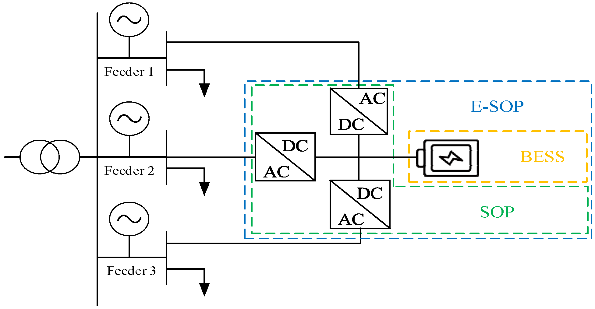 - BESS-only configuration: The system also includes feeders, substations, PV, and wind power, but no flexible interconnection devices (i.e., no SOP).