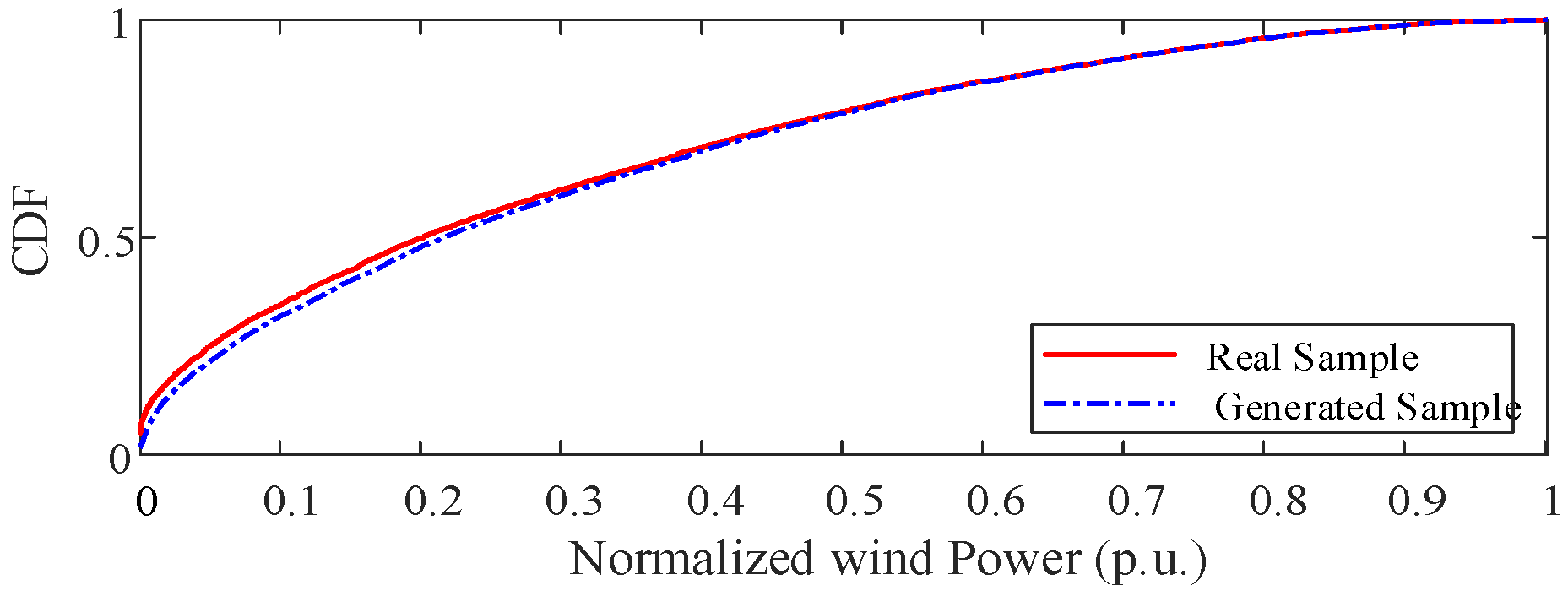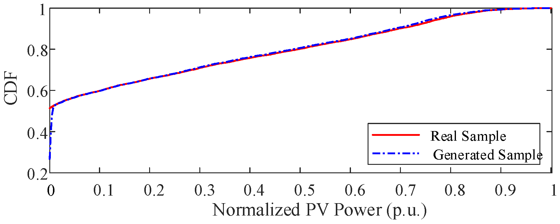 - The WGAN-GP-based wind–solar scenario generation model effectively captures the high-dimensional stochastic characteristics and temporal correlations of renewable energy outputs. The generated samples exhibit strong consistency with historical data in terms of probabilistic distribution and coverage of extreme events. Compared to traditional probabilistic fitting and clustering methods, the WGAN-GP model does not rely on distributional assumptions, resulting in scenarios that are more realistic and representative, thereby providing high-quality input data for planning models.