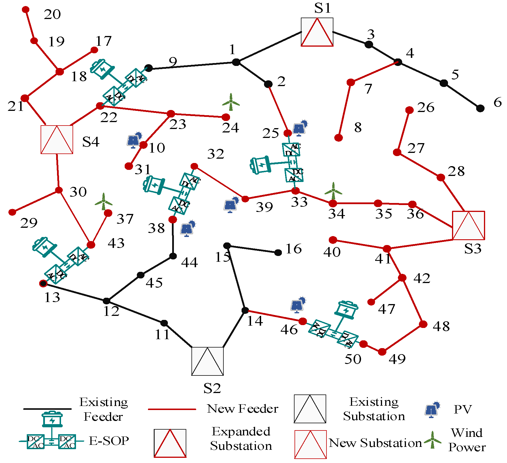 - SOP-only configuration: The system includes conventional resources such as feeders, substations, PV, and wind power, but does not include any energy storage devices.