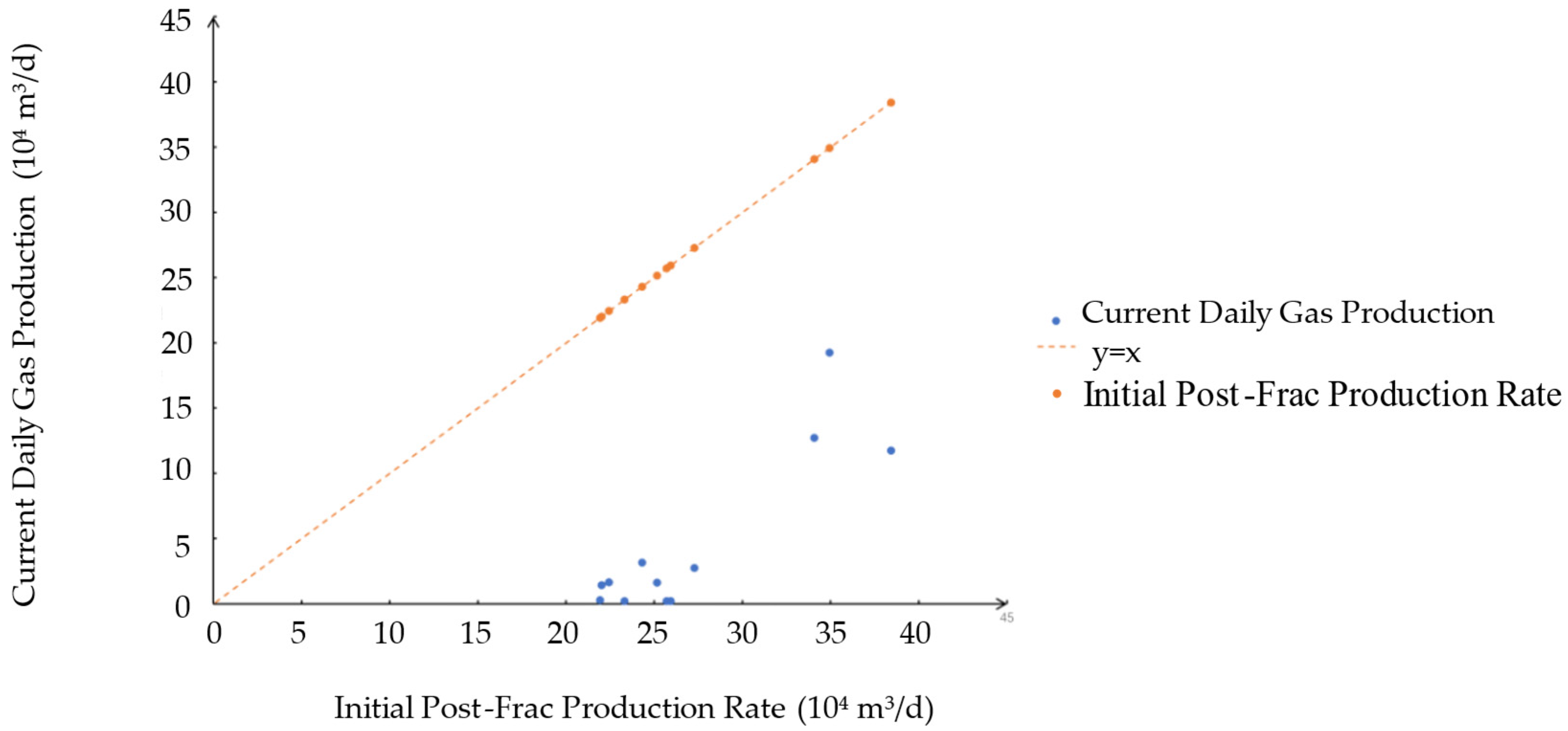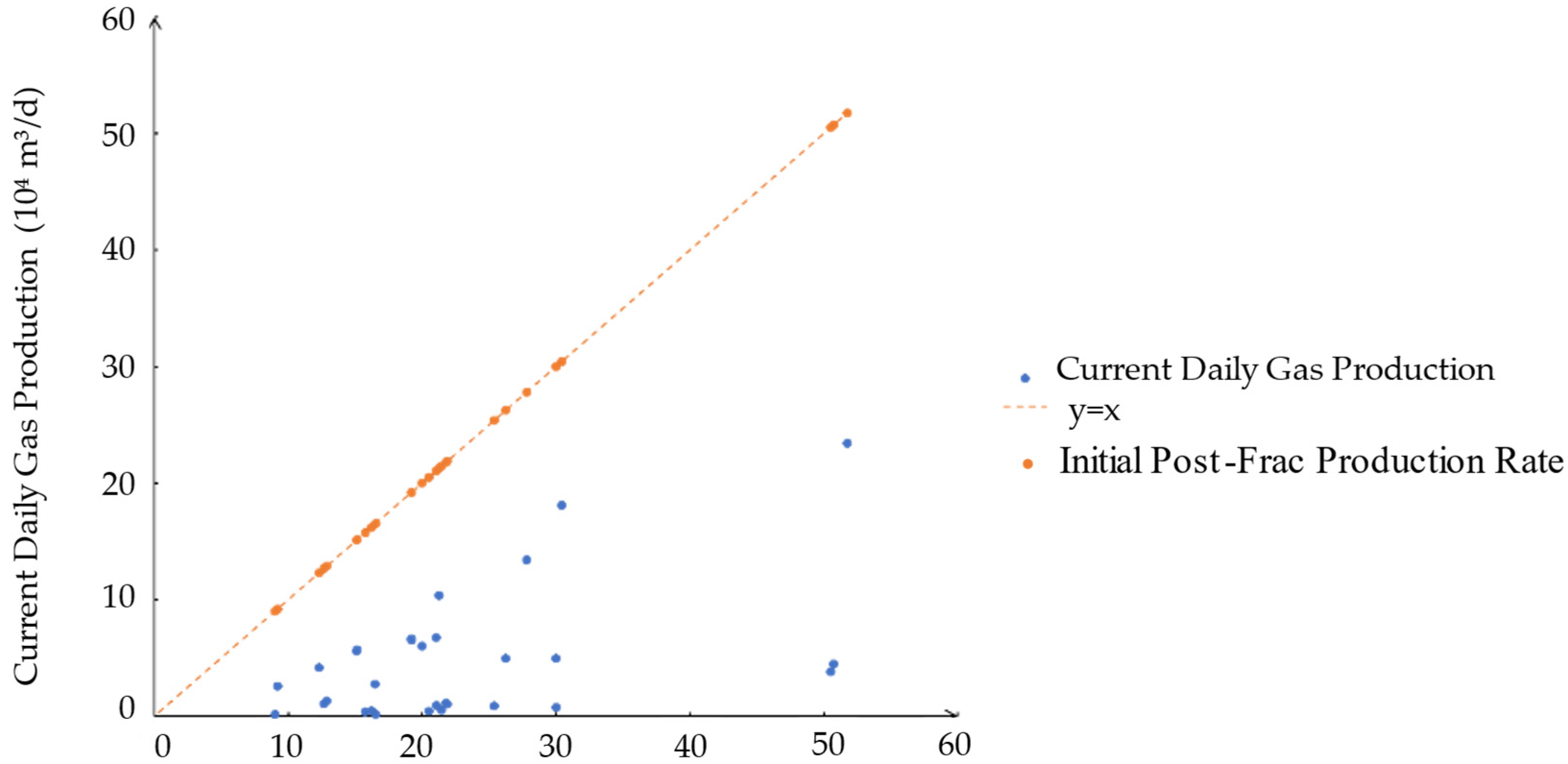 The threshold value is defined as the value of the reservoir depletion coefficient at which the slope of its relationship curve with the daily gas production rate equals −1.
