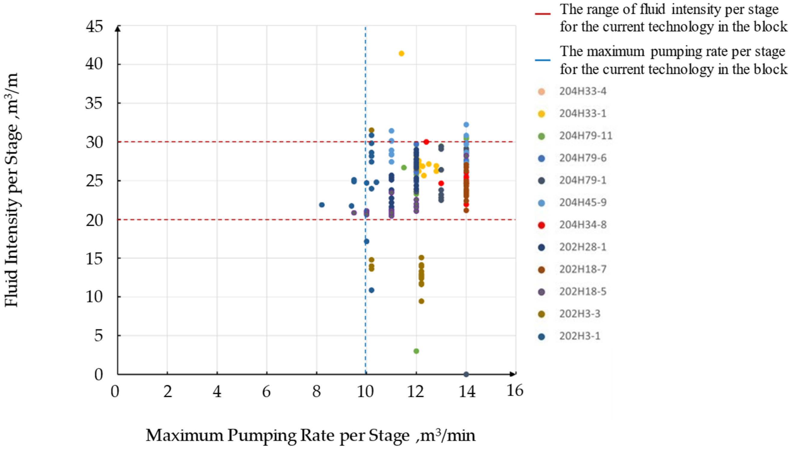 A crossplot of fluid intensity per stage versus maximum treatment rate per stage, as shown in