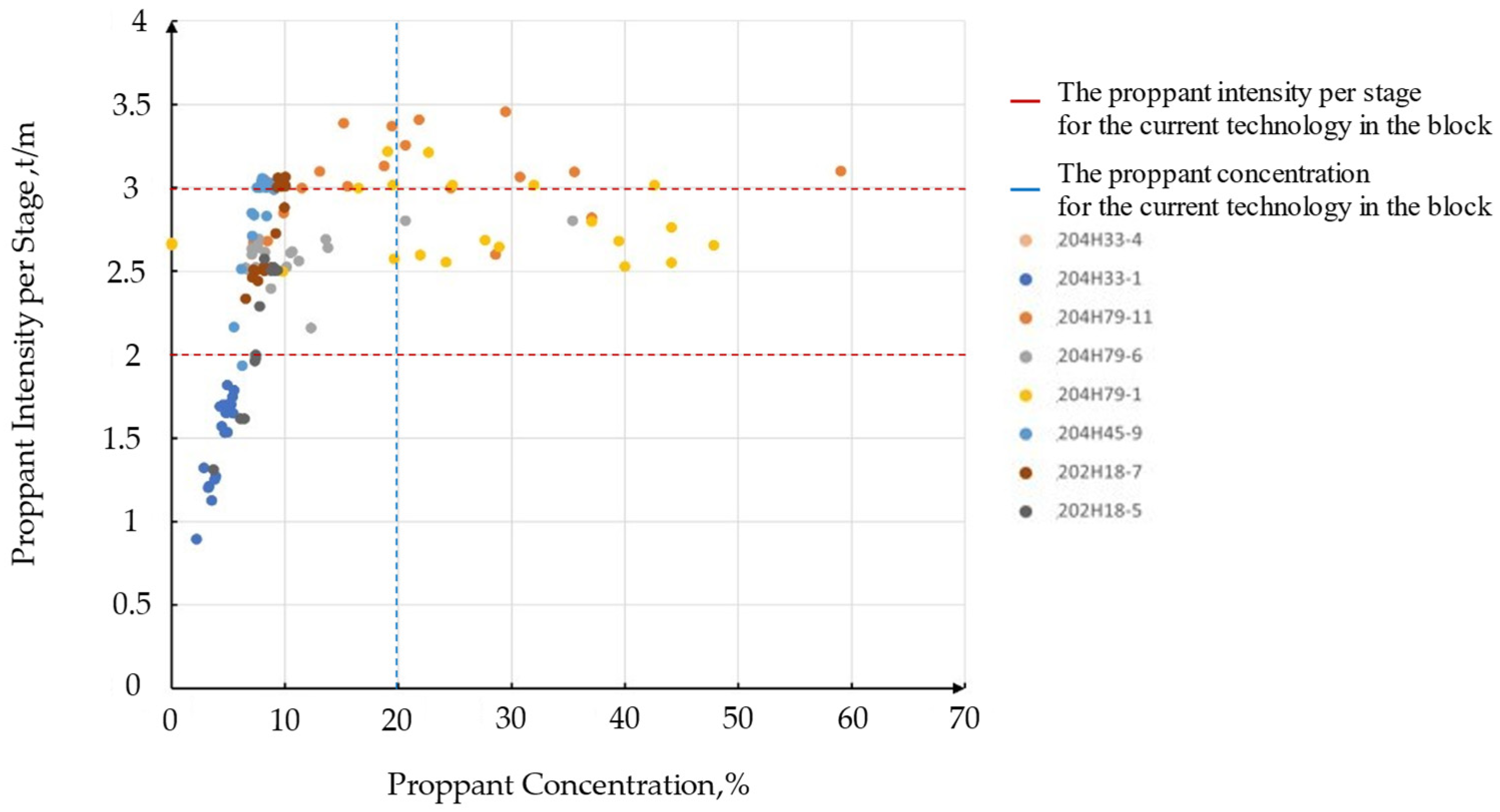 A crossplot of proppant intensity per stage versus proppant concentration, as shown in