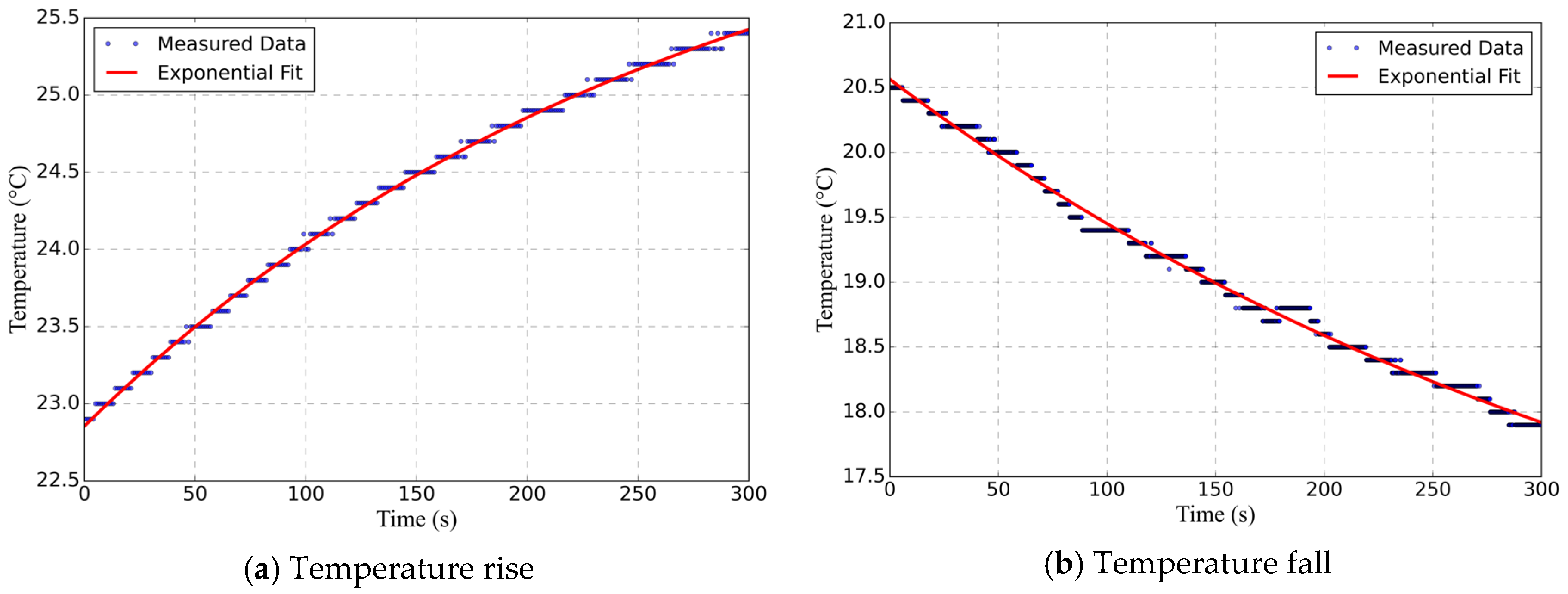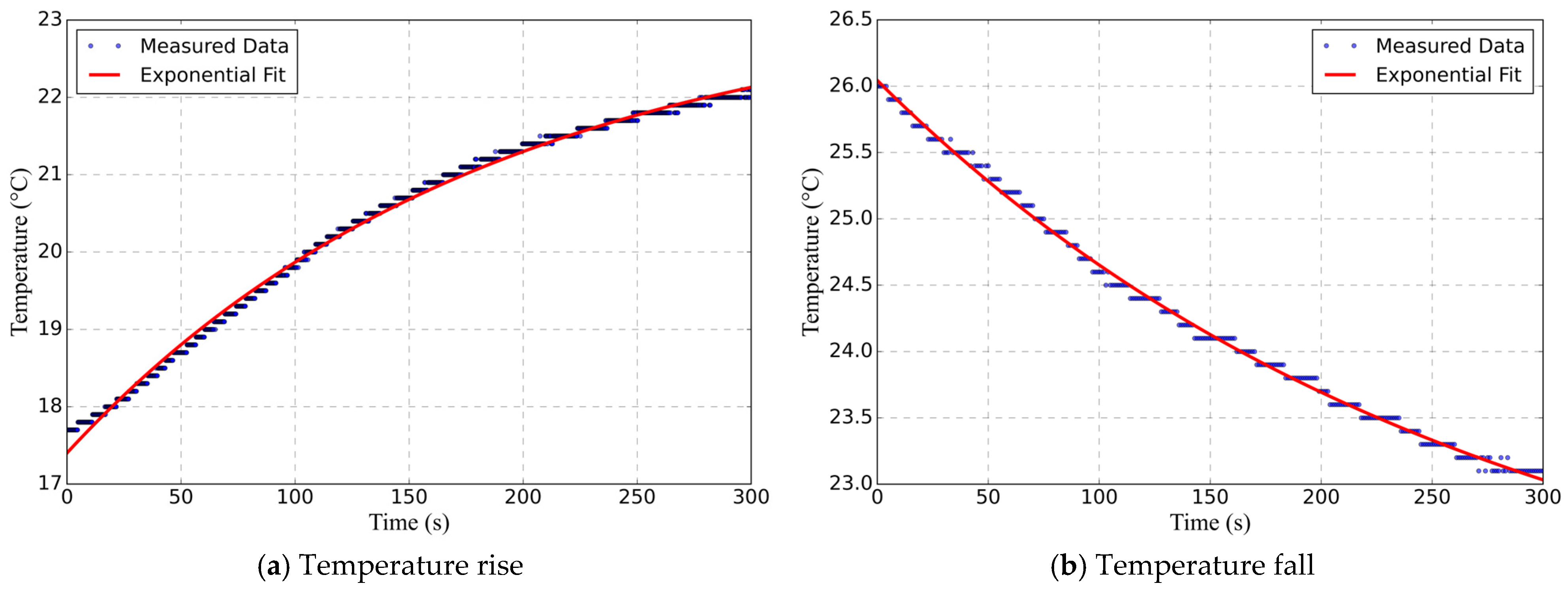 - Different Ambient Temperature Variations. During testing, the ambient temperature rise and fall were regulated as follows: For the temperature rise process, the air conditioner was first activated to stabilize the ambient temperature at approximately 22 °C, and then the setpoint was adjusted to 28 °C to induce a temperature rise. For the temperature fall process, the air conditioner was first activated to stabilize the ambient temperature at approximately 22 °C, and then the setpoint was adjusted to 16 °C to induce a temperature drop. The ambient temperature was measured using the same experimental method described in Section 3.1. The measured ambient temperature variation data and their corresponding fitted curves are illustrated in Figure 9. Equations (40) and (41) represent the fitted equations for the temperature rise and temperature fall curves, respectively.