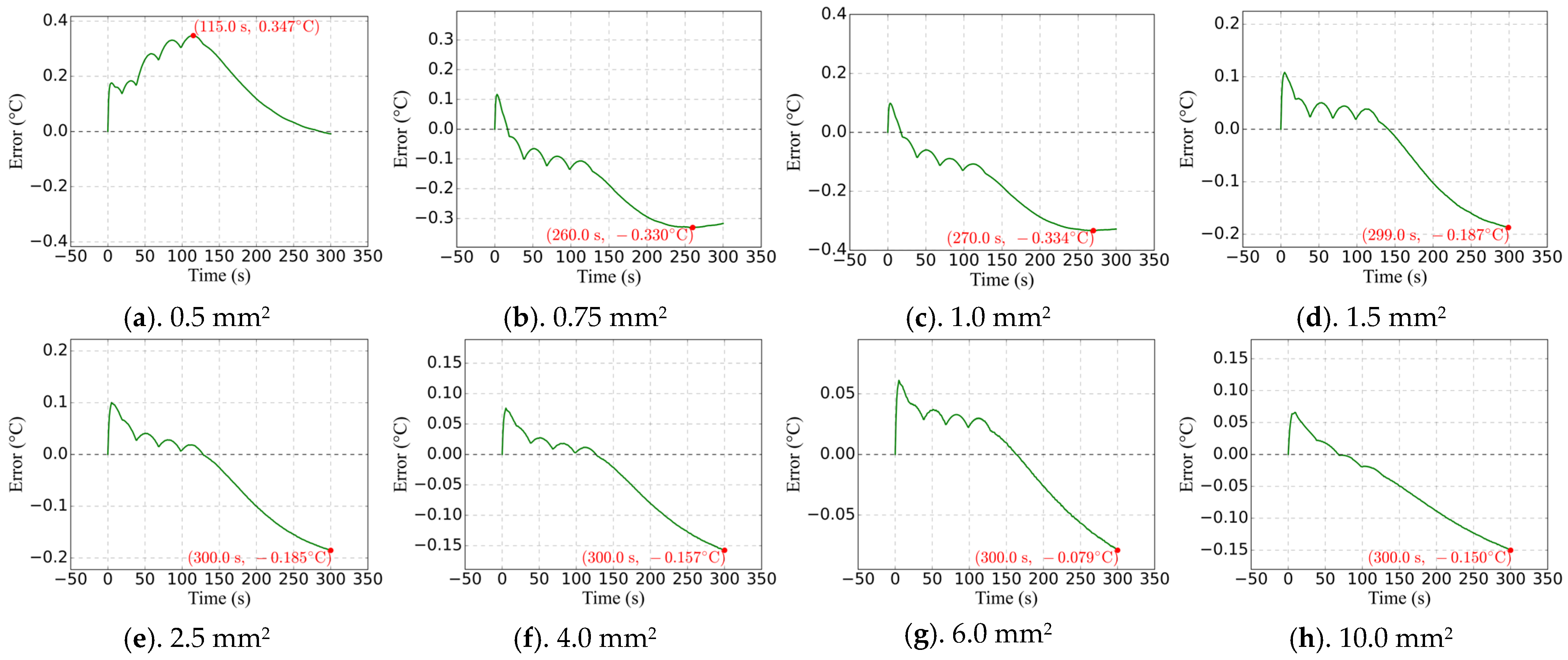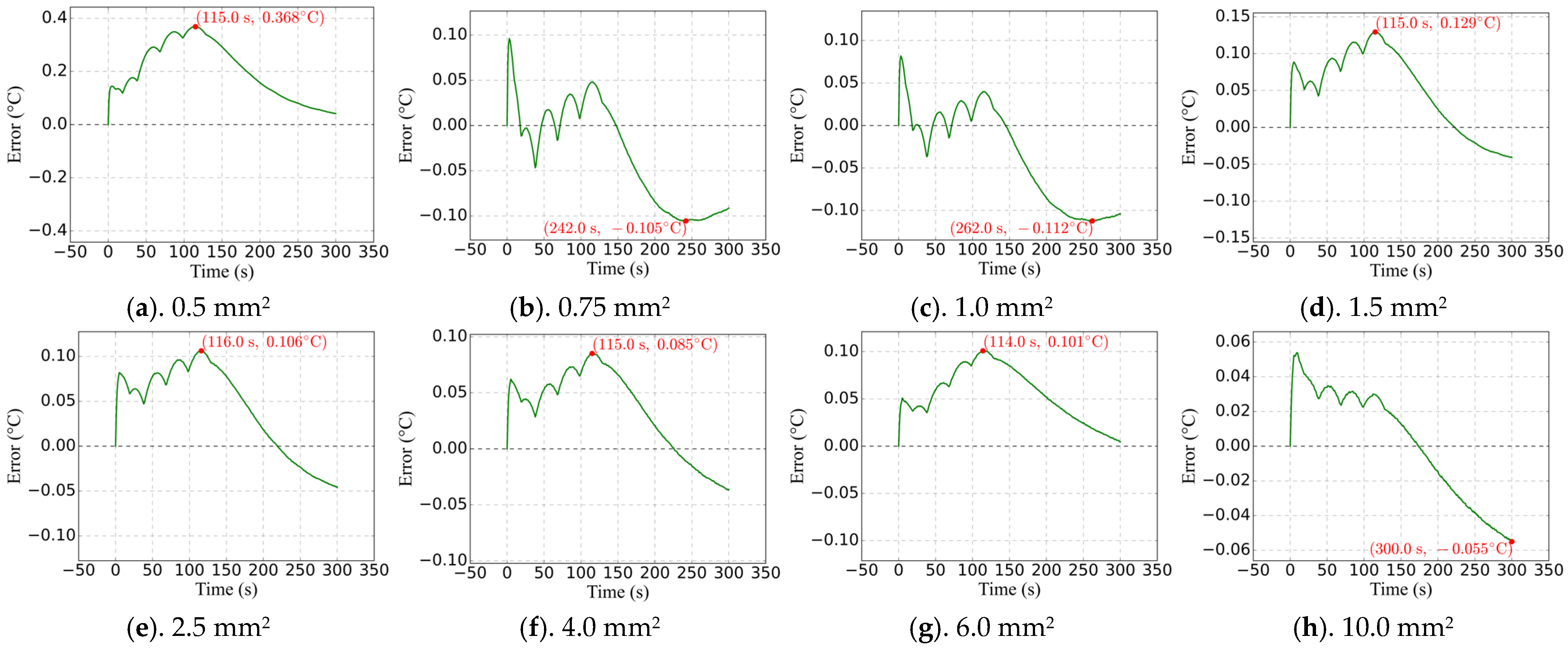 - Different Initial Conductor Temperatures. To simulate an autumn or winter scenario, the outdoor temperature was assumed to be 10 °C, and the initial temperature of the conductor was set to match this outdoor temperature. Using the same finite element simulation method described in Section 3.2 and based on the ambient temperature profiles under testing conditions shown in Figure 9, the corresponding conductor temperature profiles for various specifications were obtained. These are illustrated in Figure 10 and Figure 11, with the corresponding errors shown in Figure 12 and Figure 13.