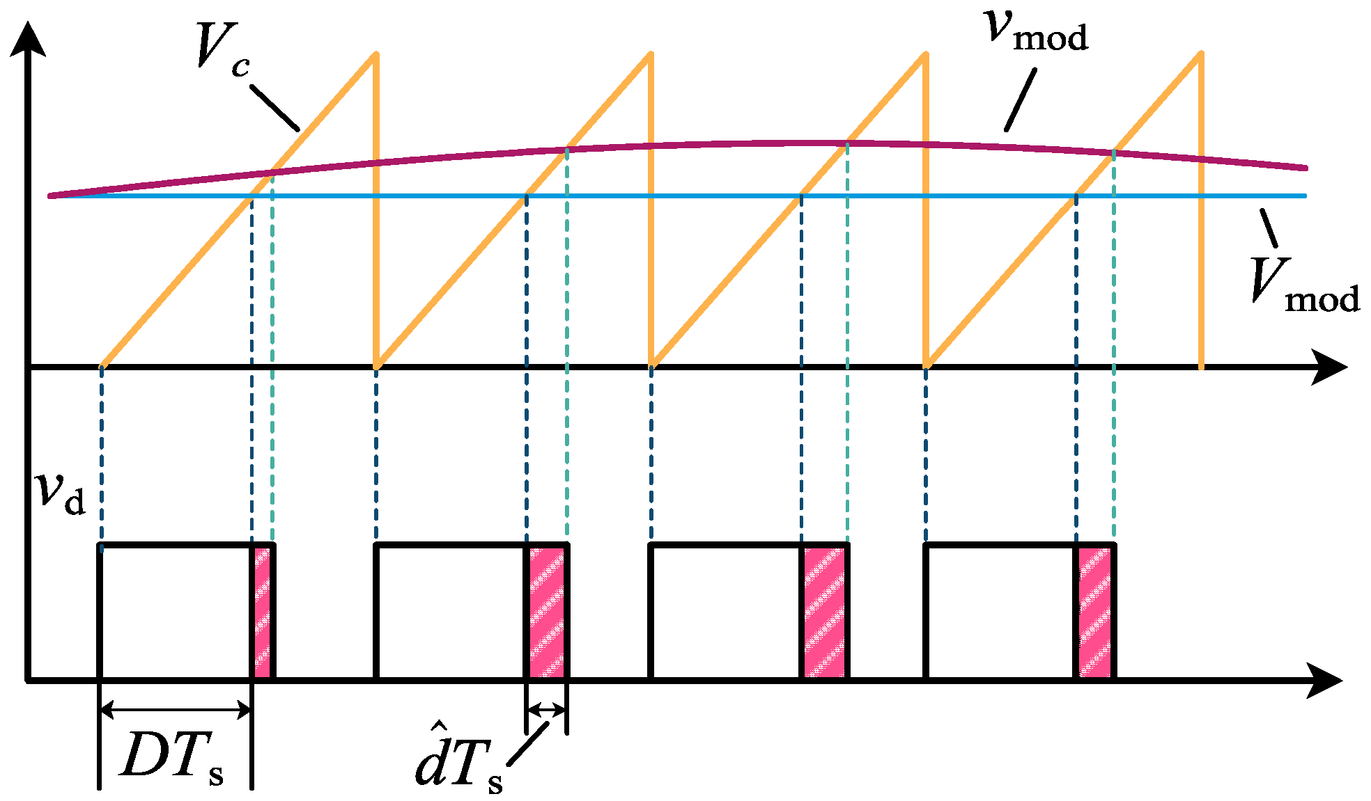 26]. These advanced models explicitly account for the characteristics of the modulation stage. Fundamentally, the pulse width modulation (PWM) process acts as a non-linear sampler, regardless of whether the control implementation is analog or digital. A perturbation at a baseband frequency,