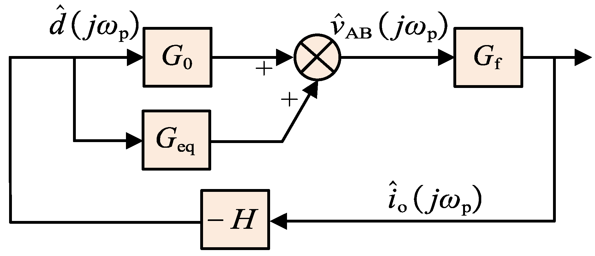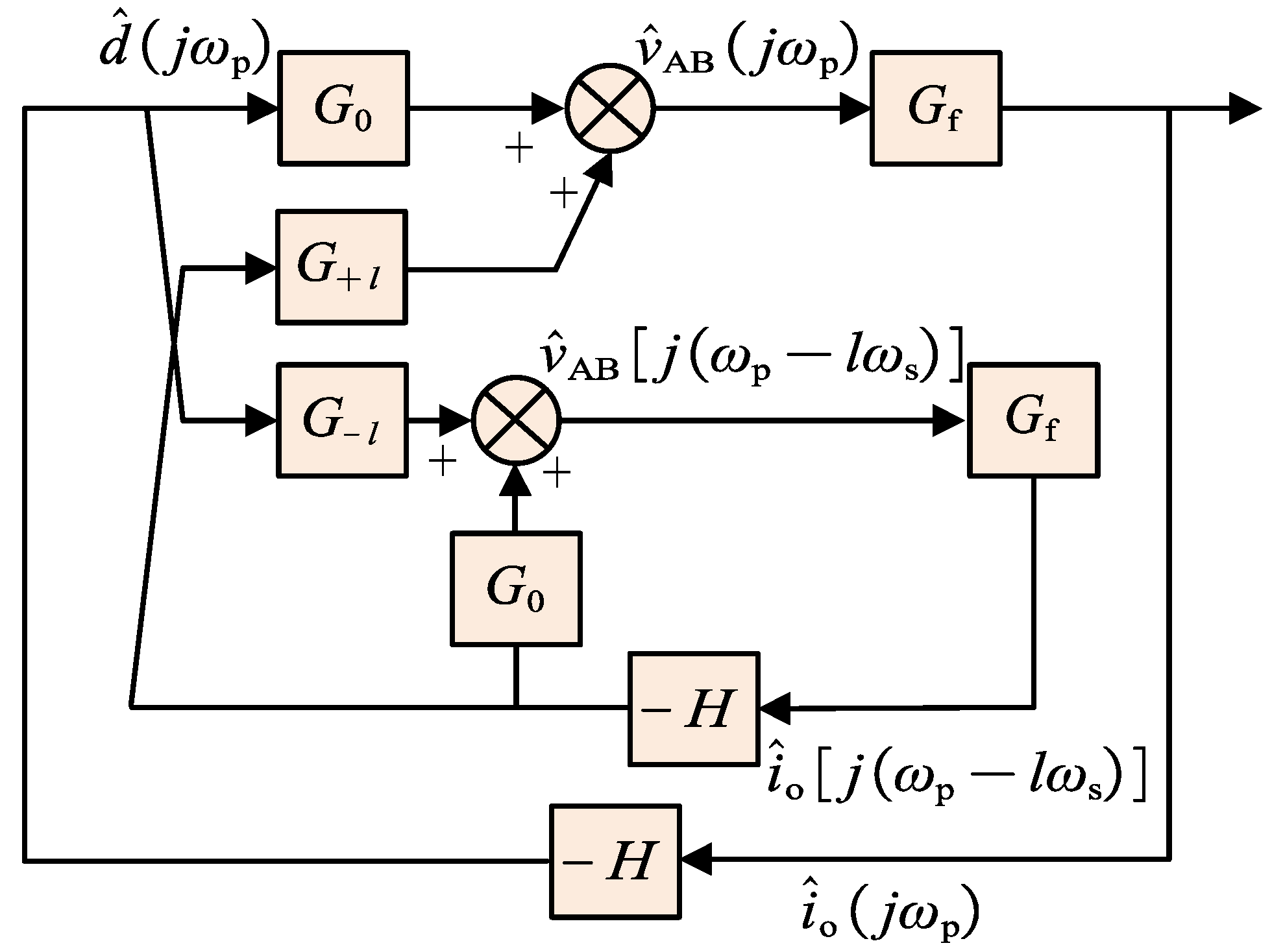 The figure below illustrates the block diagram with closed-loop control. After passing through the modulator, the duty cycle control signal generates not only the signal AB(jωp) at the same frequency but also the sideband component AB[j(ωp + lωs)] due to the frequency-shifting effect. This component then passes through the compensator −H and is shifted back to the frequency ωp via the frequency-shifting action of G+l.