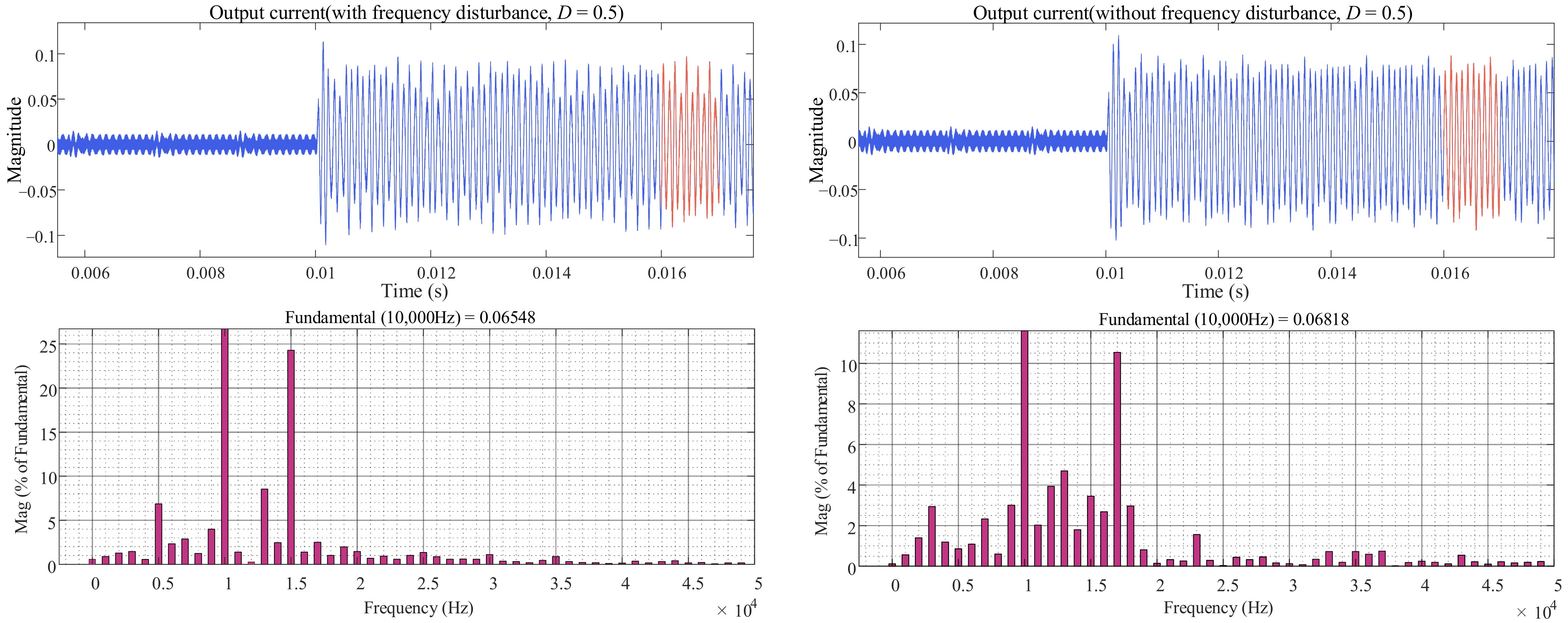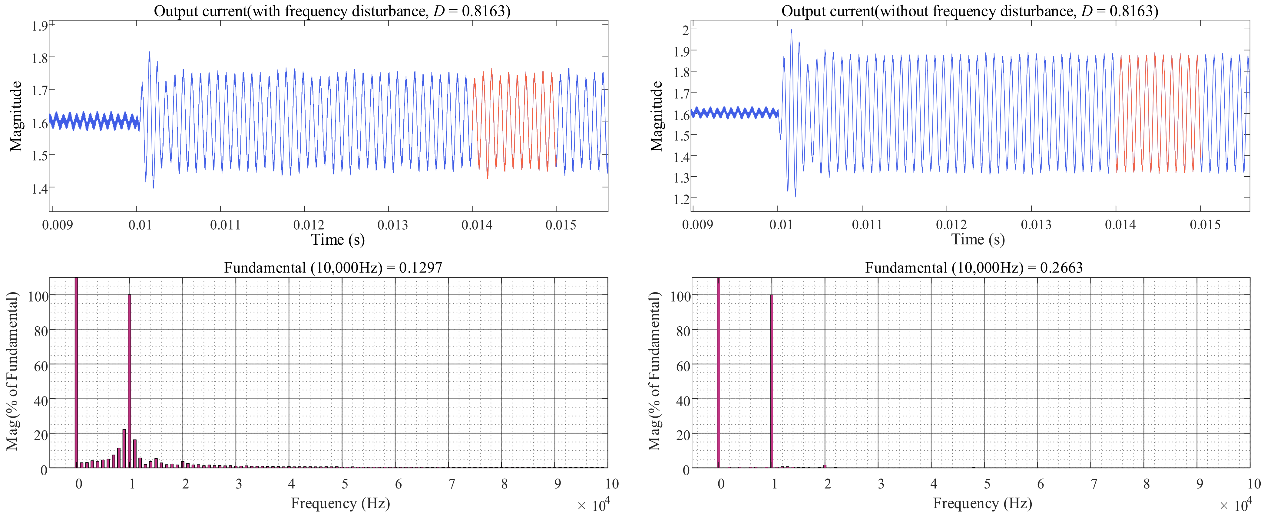 D = 0.5, according to (26), the frequency perturbation will not affect the amplitude of the output current sideband frequency at 10 kHz. From the simulation and FFT analysis in