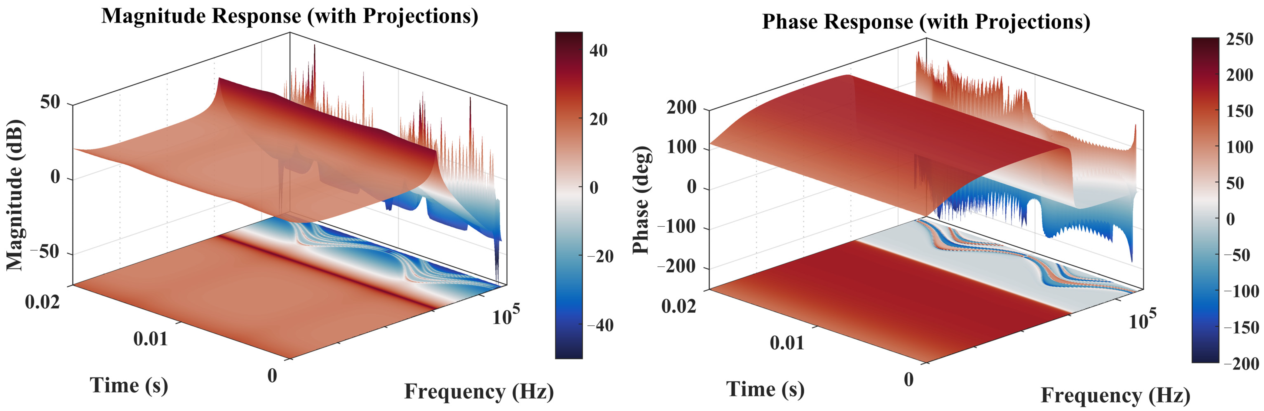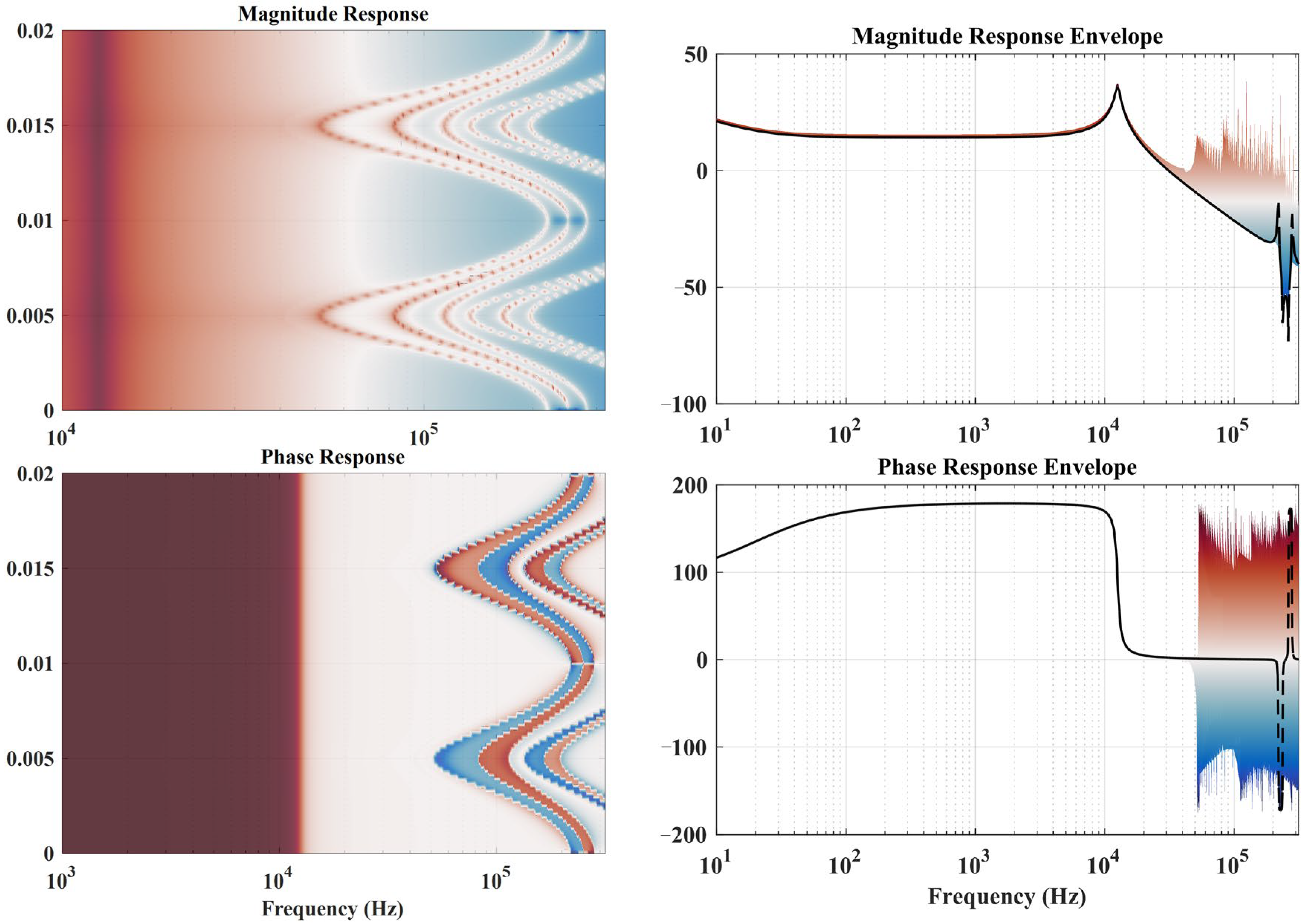 The projection on the x–y plane shows that the trend of loop gain magnitude and phase variation with time is related to the switching frequency. Resonance peaks are also generated on both sides of the switching frequency, which will cause a significant impact when designing high-bandwidth controllers.