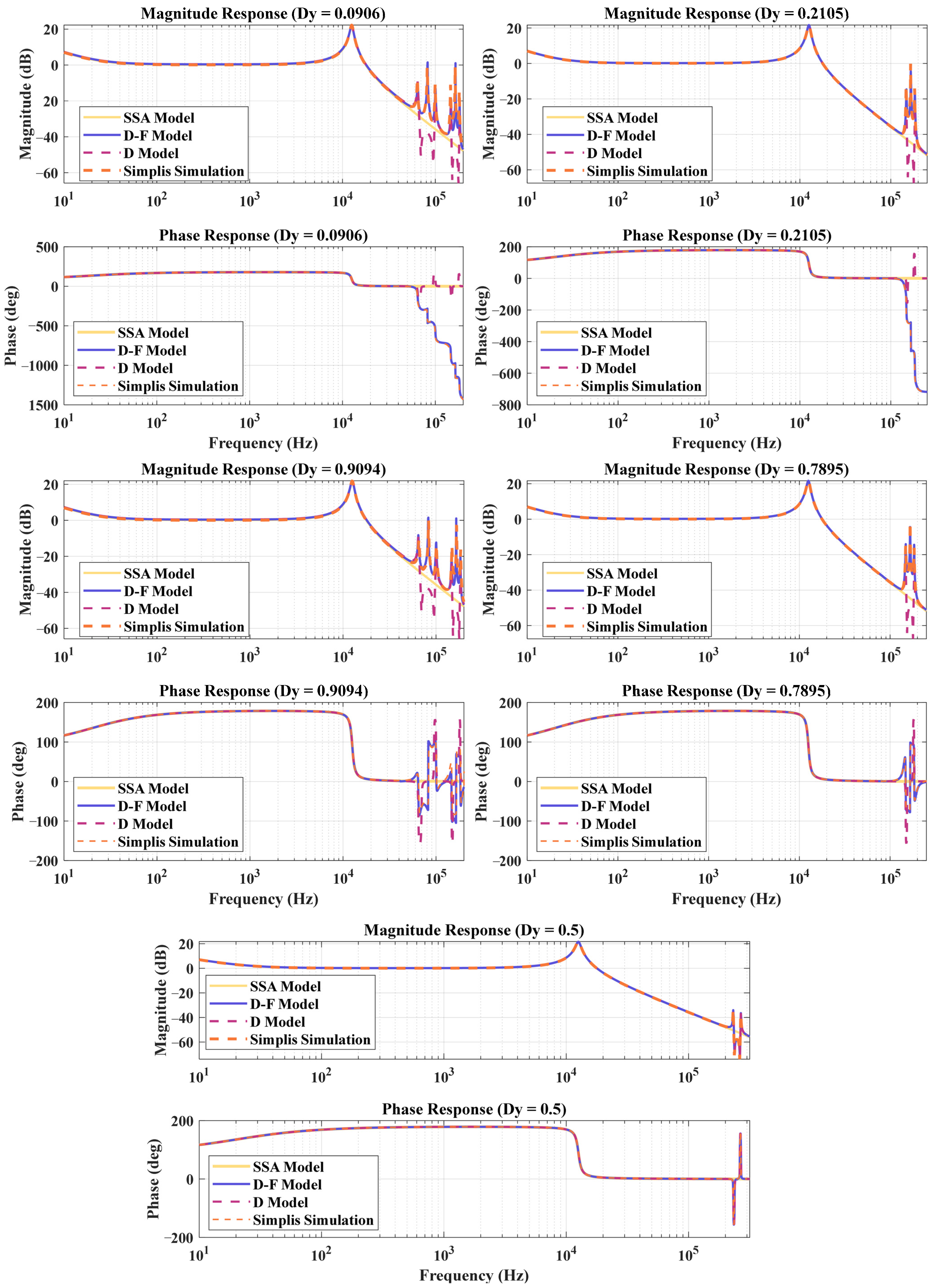 The D and D-F models coincide when Dy = 0.5. However, as the duty cycle deviates from 0.5, significant discrepancies emerge in the high-frequency band. The D model fails to predict the distinct gain and phase variations as the perturbation frequency approaches the switching frequency.