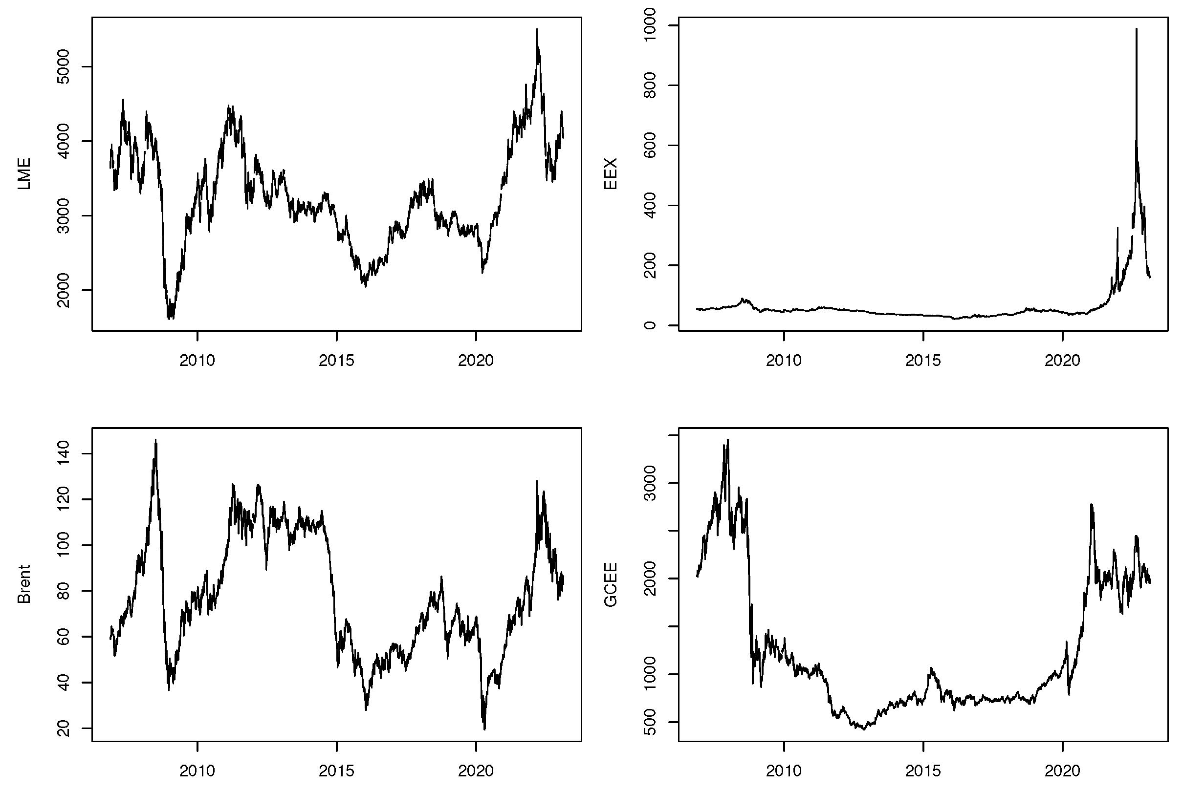 3]. Consequently, fossil fuels, metals, clean energy stocks, and electricity markets are interconnected through multiple channels, including production costs, input substitution, technology deployment, and investment behavior. Price fluctuations or shocks originating in any one of these markets can propagate across the system, affecting the dynamics of other markets and shaping the overall structure and stability of the energy system.