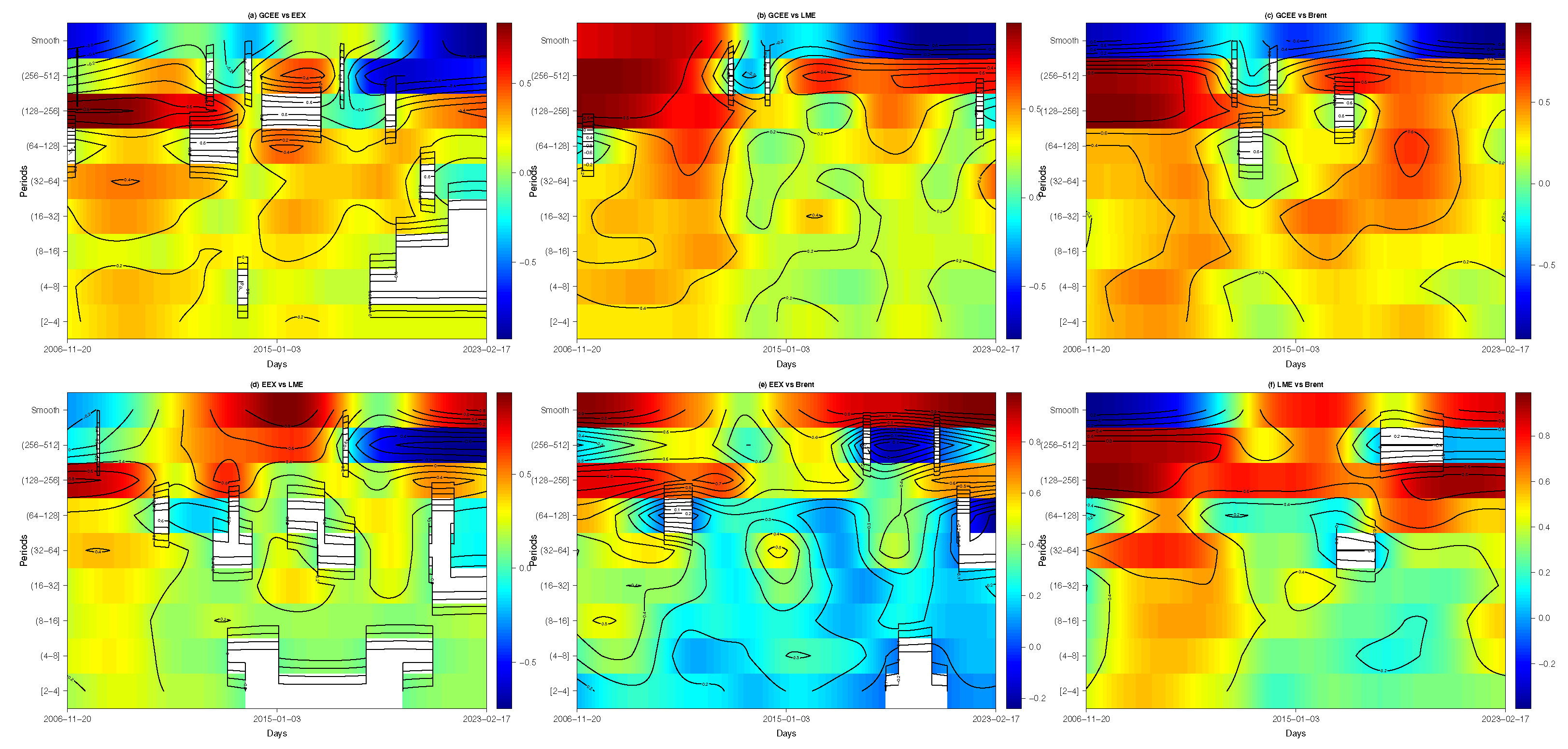 Figure 2f is predominantly colored yellow and red, indicating that the correlation between LME and Brent is consistently positive across most time scales and time ranges throughout the sample. This positive correlation suggests that an increase in oil prices typically coincides with a rise in metal prices. In the 256–512 day frequency band, the high correlation observed before 2015 (dark red) gives way to a patch of blue/light blue correlation post-2017. This suggests a period of long-term divergence between the two markets, where factors specific to the metal market (e.g., changes in Chinese demand, shift to electric vehicle materials) or the oil market (e.g., US shale boom impact) may have temporarily overridden the general energy-input cost linkage. There is a widespread and persistent high correlation (dark red area) across the medium-term frequency bands (128–512 days). This high coherence spans almost the entire sample period (2006–2023). The high correlation coefficients (often exceeding 0.8) indicate a strong and reliable co-movement in the medium run. This finding underscores a robust structural link between the global oil and metal markets. Since energy is the main input cost for metal mining, smelting, and refining, structural changes and long commodity cycles fundamentally drive the synchronous development of these two markets.