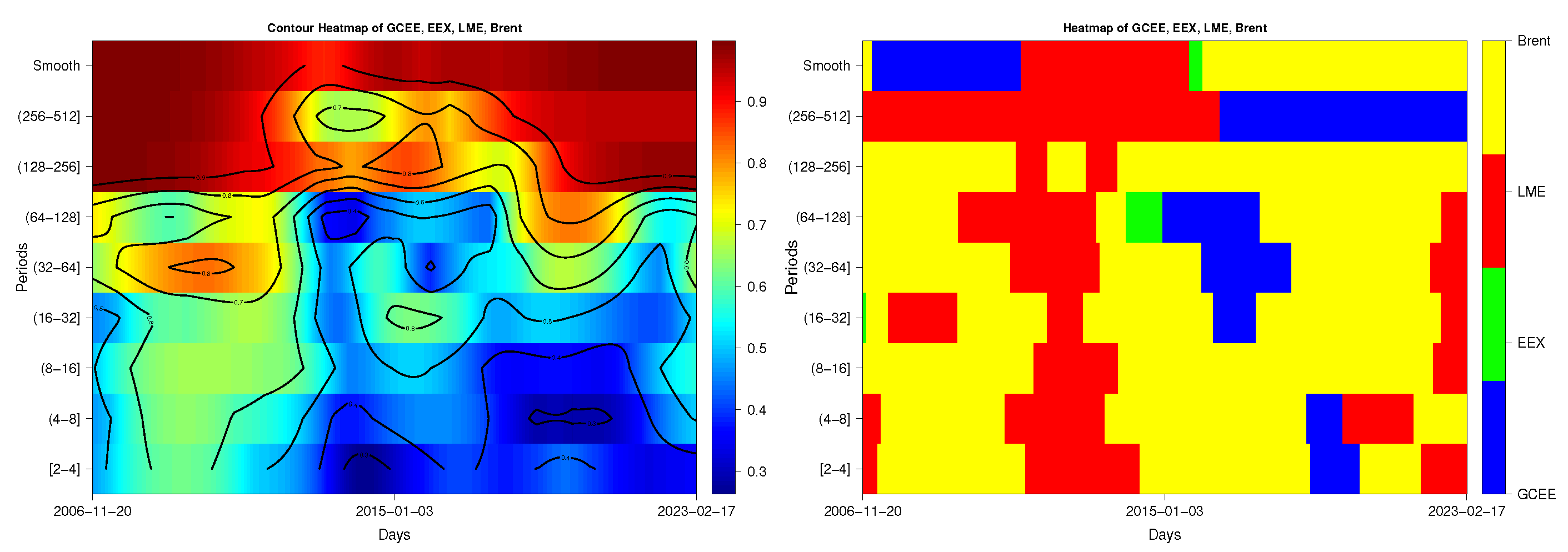 Figure 2 illustrates the bivariate wavelet coherence between clean energy (GCEE) and electricity (EEX), metals (LME), and fossil fuels (Brent), as well as the interrelationships among electricity, metals, and fossil fuels. The horizontal axis spans the time domain from 2006 to 2023, and the vertical axis is the frequency domain ranging from 2 to 512 days. Frequencies at or beyond 512 days are designated as “smooth”, indicating the point at which the correlations align with the unconditional correlations. The heatmap legend next to each figure utilizes cooler and warmer colors to represent weaker and stronger correlations, respectively. The white spaces indicate non-significant correlations at the 95% confidence interval. The black contours mark the specific correlation values. The relationships between these markets can change significantly across different time scales (periods) and time frames (years). At high-frequency bands (2–16 days), the weak correlations across markets indicate that short-term price fluctuations are mainly affected by idiosyncratic shocks, speculative trading, and market-specific news. Medium-frequency bands (32–128 days) reflect investors’ behavior and portfolio reallocation in response to macroeconomic news, policy announcements, and market expectations. There are noticeable “islands” of high coherence in the medium-frequency bands (64–128 days) coinciding with major global events, such as the Global Financial Crisis (around 2008), the 2014 oil crisis, and the post-2020 period (COVID-19 and the Russia–Ukraine conflict). Most notably, a striking feature present in almost all charts is the strong coherence (red area) in the long-term frequency bands (cycle of 256–512 days), indicating that the fundamental links between these markets are driven by long-term structural forces rather than short-term speculative shocks. These include global business cycles, energy transition trends, and sustained changes in production costs and input demand. From a long-horizon perspective, clean energy, fossil fuels, metals, and electricity prices are jointly driven by shared macroeconomic fundamentals, indicating a high degree of long-run integration within the energy commodity system.