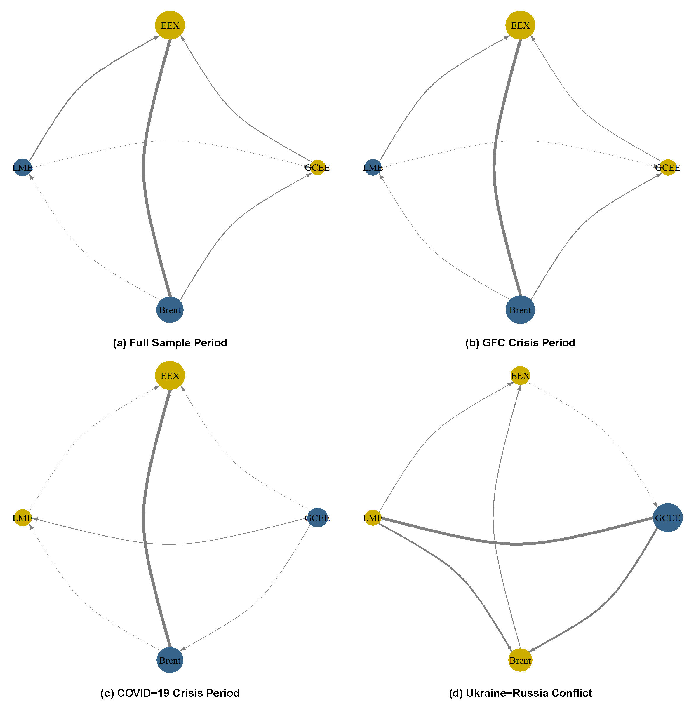 Figure 4 depicts the network connectedness of the four markets during the full period and the crisis periods. It allows for analyzing the intensity and the direction change of the market spillovers. Over the sample period, spillovers mainly flowed from clean energy, metals, and fossil fuels to the electricity market. Fossil fuels consistently act as a dominant net transmitter of shocks, reflecting their foundational role in the global energy system and their influence on production costs across sectors. During the global financial crisis, the overall interconnectedness of the system reached its highest level, indicating extreme market contagion. Fossil fuels remained the primary channel through which systemic shocks were transmitted to all other sectors. The COVID-19 pandemic has triggered a surge in the spillover effects of clean energy to other markets. The Clean Energy market became more influential than traditional energy during the pandemic. During the Russia–Ukraine conflict, the Clean Energy market emerged as the dominant net transmitter of shocks to the system, with its spillover effects to the Metals and Fossil Fuel markets intensifying significantly. At the same time, while the clean energy market has a greater influence on other markets, the metals market also maintains a significant mutual influence on the clean energy market. Shocks in clean energy markets may be transmitted to fossil fuel and metal markets through anticipated channels, investment substitution effects, and adjustments in upstream demand for critical materials. We can conclude that the GCEE has transformed from a market that passively absorbed the shock during the 2008 global financial crisis into a systemic driver that now transmits significant volatility to the fossil fuel and metals markets during the current global crisis.