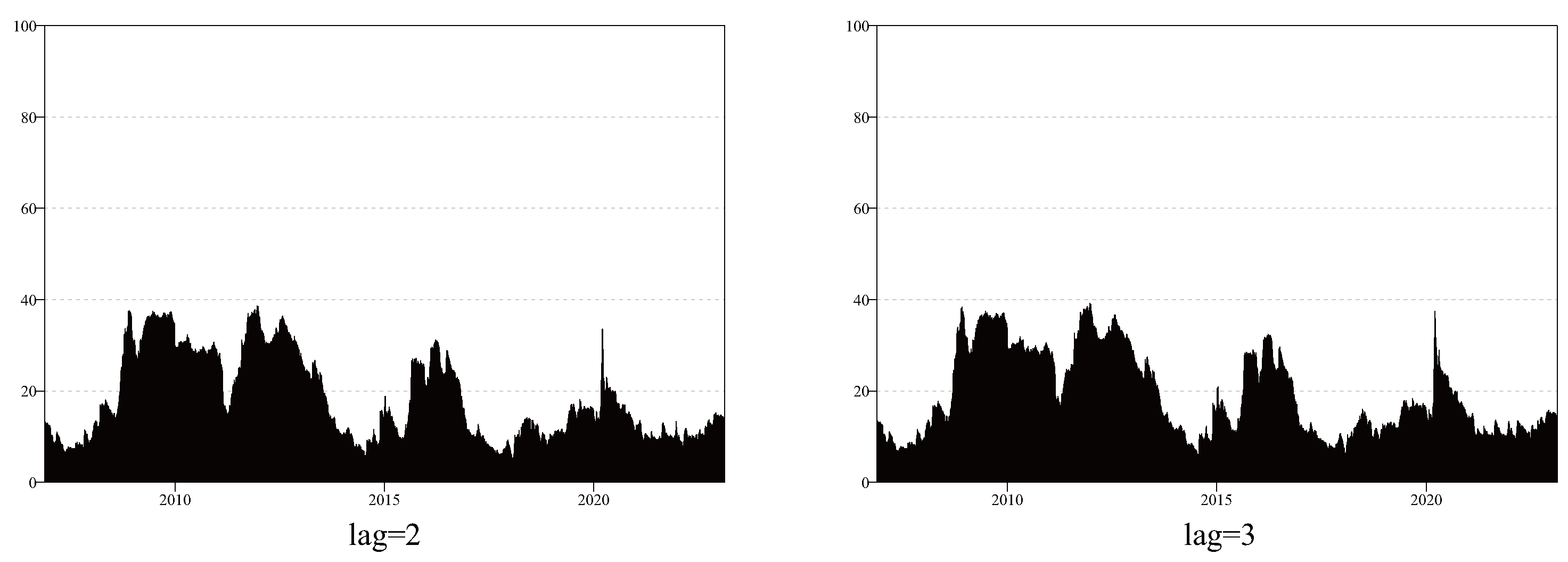 To assess the sensitivity of our empirical results to model parameter choices, we used WTI crude oil as an alternative proxy for the crude oil market and the Nasdaq Clean Edge Green Energy Index as a substitute measure of the new energy market, while also varying the forecast horizon and the lag order of the variables. Specifically, we re-estimate the time-varying aggregate spillovers using the TVP-VAR model with lag orders of 2 and 3, as well as forecast horizons of 5 and 15 steps, and compared these results to those of the benchmark model, which employed a lag order of 1 and a forecast horizon of 10 steps.