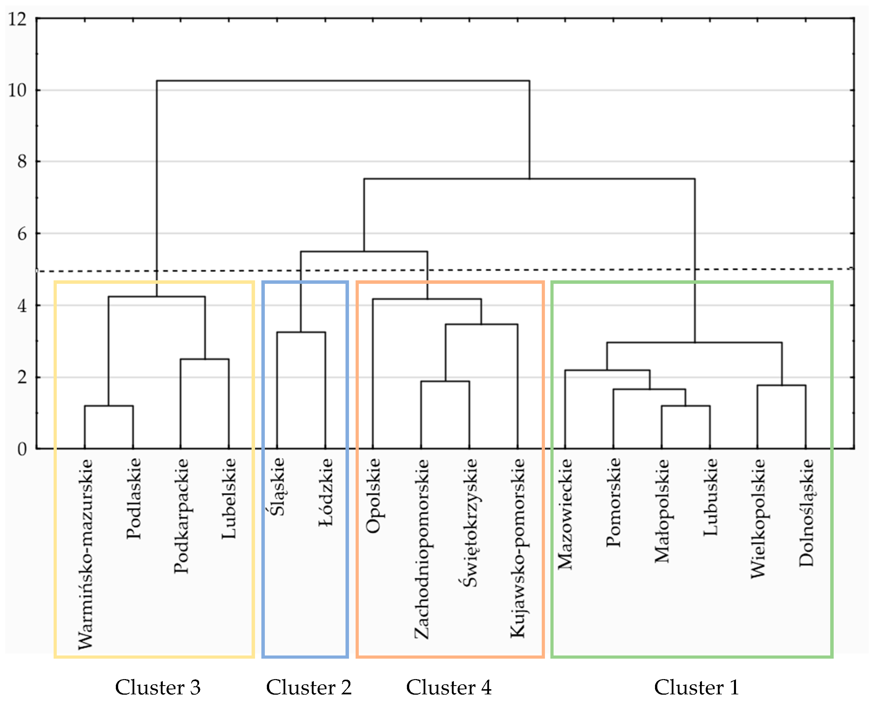 www.strateg.stat.gov.pl. The most up-to-date accessible database was used—as of 1 October 2025. The MCA, operationalized through the construction of a Synthetic Measure of Potential (SMP) incorporating all ten presented disaggregated indicators, and supported by cluster analysis based on Ward’s method, was performed using STATISTICA analytical software. Additionally, a classical coefficient was applied to assess the differentiation of both the synthetic and disaggregated measures.